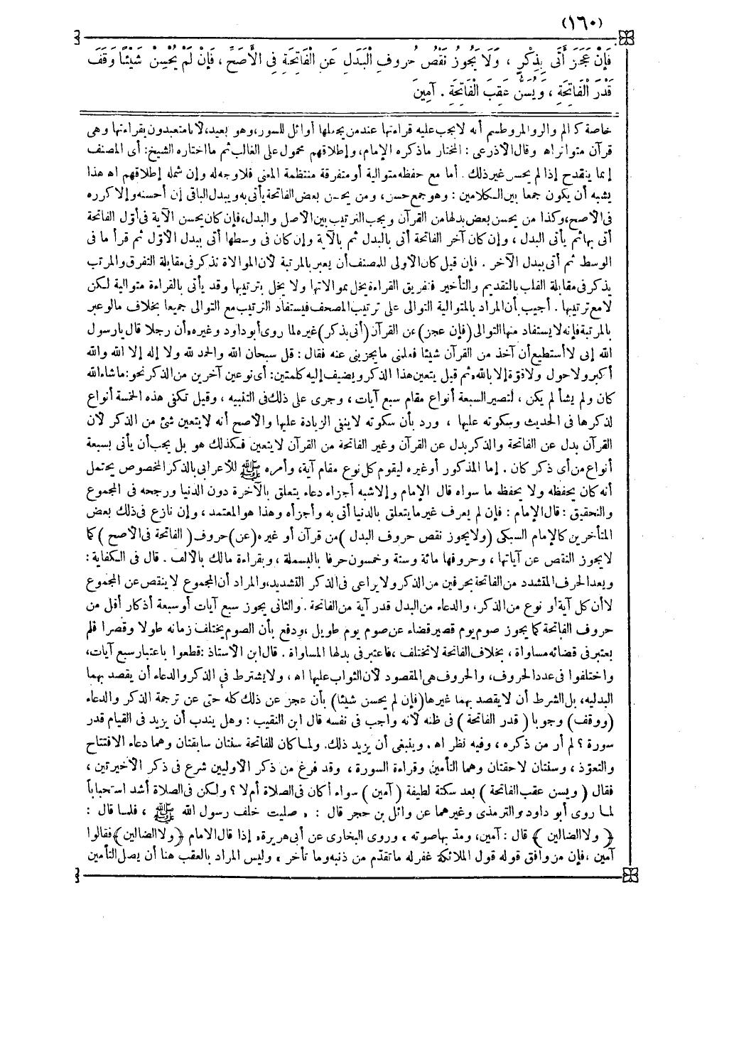 والثاني يجوز سبع آيات أو سبعة أذكار أقل من حروف الفاتحة كما يجوز صوم يوم قصير قضاء عن صوم يوم طويل ودفع بأن الصوم يختلف زمانه طولا وقصرا فلم يعتبر في قضائه مساواة بخلاف الفاتحة لا تختلف فاعتبر في بدلها المساواة