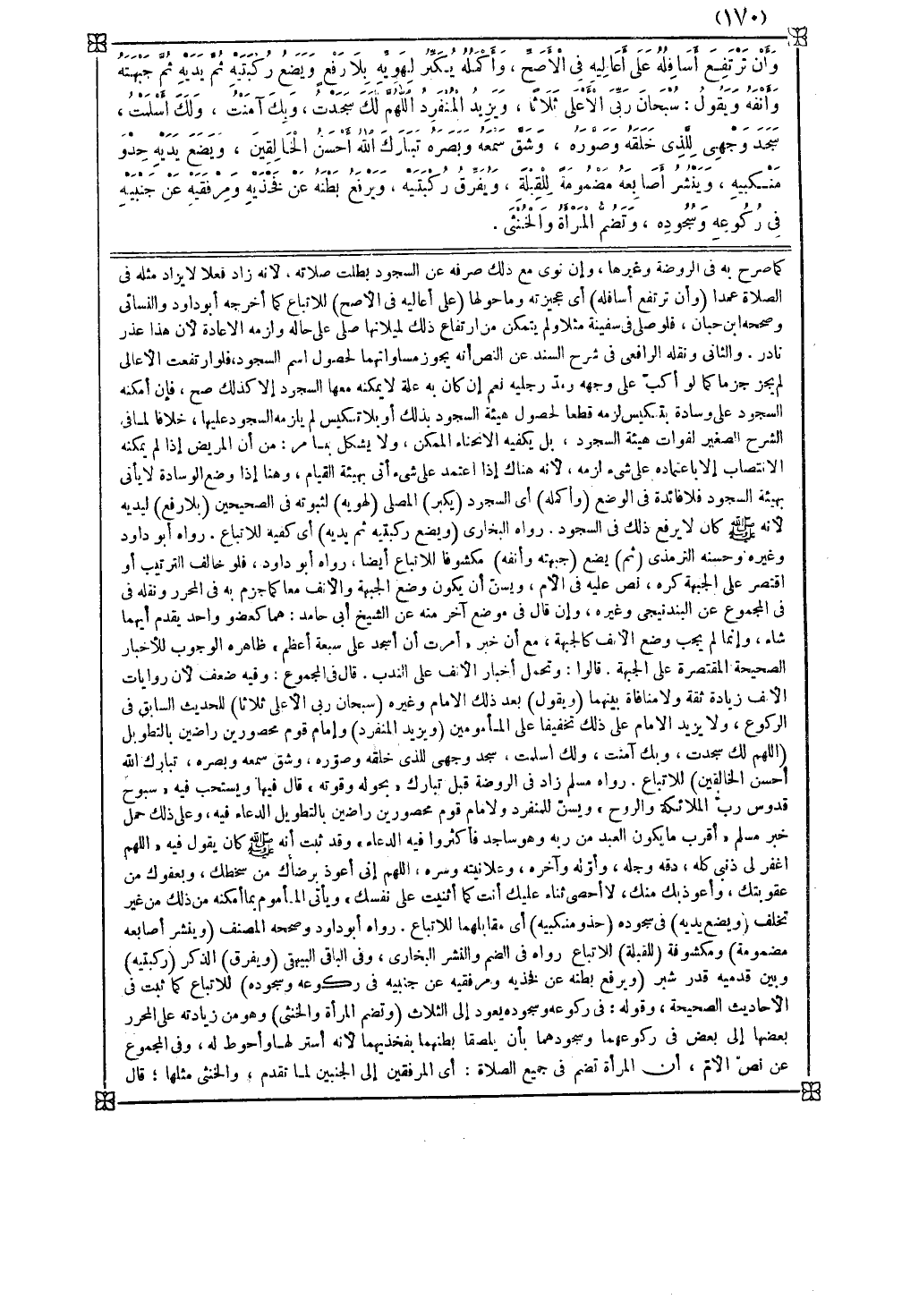 ويسن للمنفرد ولإمام قوم محصورين راضين بالتطويل الدعاء فيه وعلى ذلك حمل خبر مسلم أقرب ما يكون العبد من ربه وهو ساجد فأكثروا فيه الدعاء وقد ثبت أنه صلى الله عليه وسلم كان يقول فيه اللهم اغفر لي ذنبي كله دقه وجله وأوله وآخره وعلانيته وسره اللهم إني أعوذ برضاك من سخطك وبعفوك من عقوبتك وأعوذ بك منك لا أحصي ثناء عليك أنت كما أثنيت على نفسك ويأتي المأموم بما أمكنه من ذلك من غير تخلف