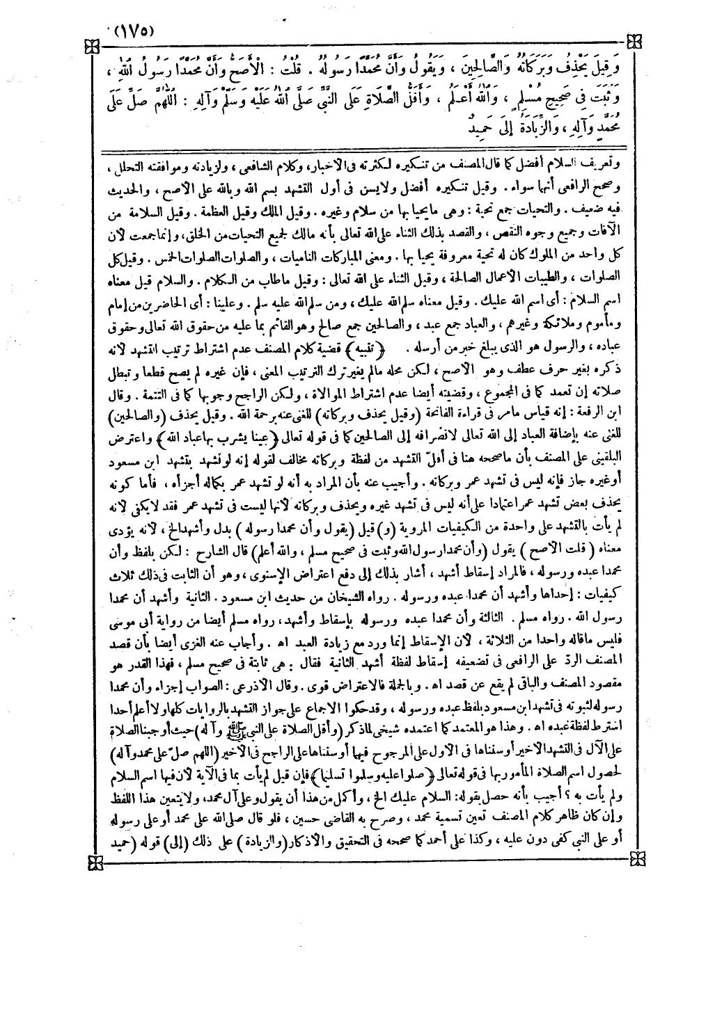 وقيل يحذف ( والصالحين ) للغنى عنه بإضافة العباد إلى الله تعالى لانصرافه إلى الصالحين كما في قوله تعالى { عينا يشرب بها عباد الله } واعترض البلقيني على المصنف بأن ما صححه هنا في أقل التشهد من لفظة وبركاته مخالف لقوله إنه لو تشهد بتشهد ابن مسعود أو غيره جاز فإنه ليس في تشهد عمر وبركاته