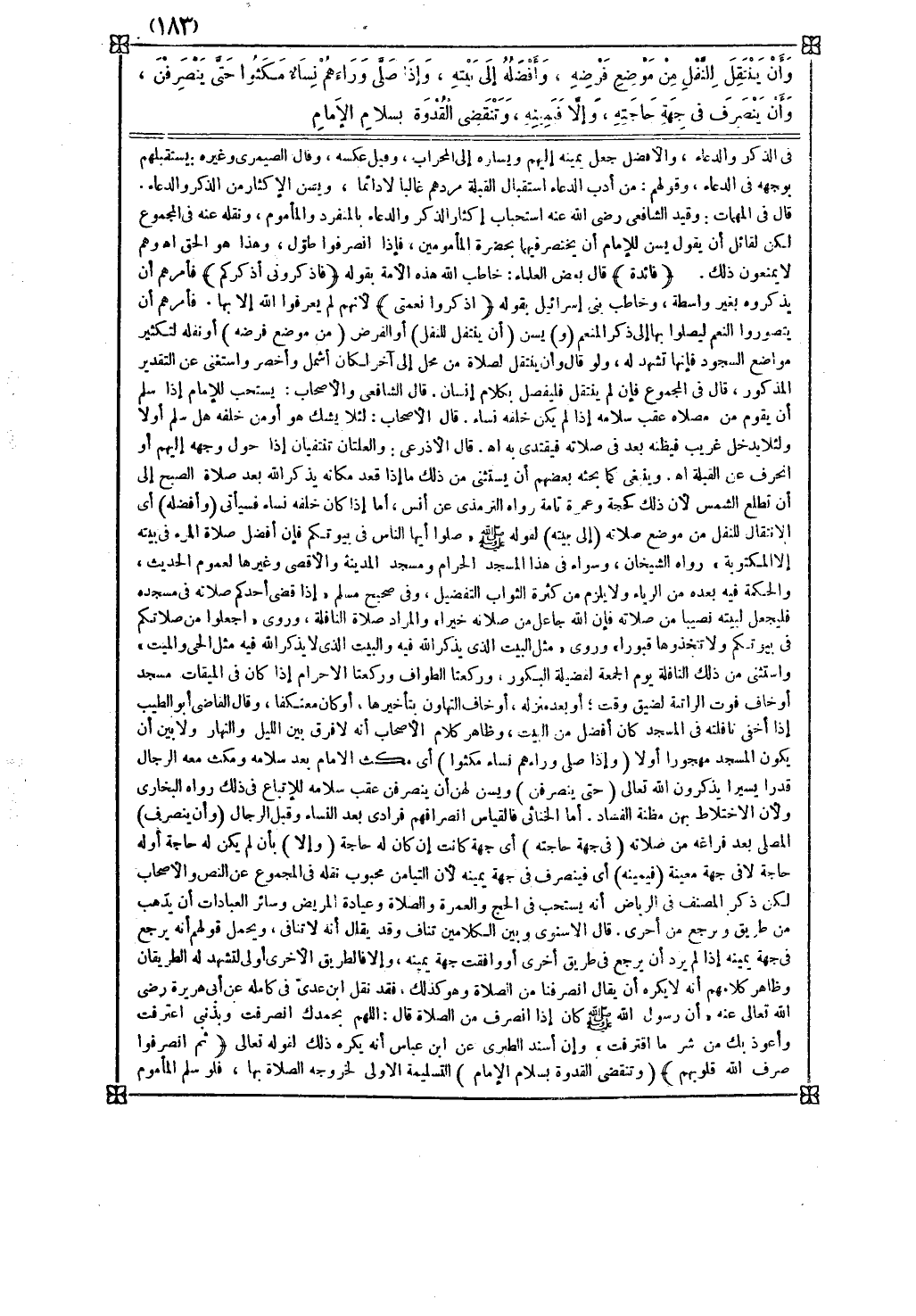 وينبغي كما بحثه بعضهم أن يستثني من ذلك ما إذا قعد مكانه يذكر الله بعد صلاة الصبح إلى أن تطلع الشمس لأن ذلك كحجة وعمرة تامة رواه الترمذي عن أنس أما إذا كان خلفه نساء فسيأتي