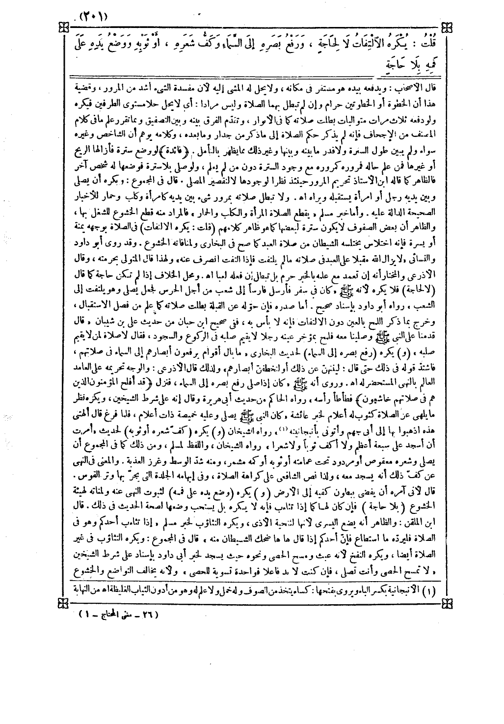 ( و ) يكره ( رفع بصره إلى السماء ) لحديث البخاري : ما بال أقوام يرفعون أبصارهم إلى السماء في صلاتهم فاشتد قوله في ذلك حتى قال : لينتهن عن ذلك أو لتخطفن أبصارهم ولذلك قال الأذرعي : والوجه تحريمه على العامد العالم بالنهي المستحضر له اه