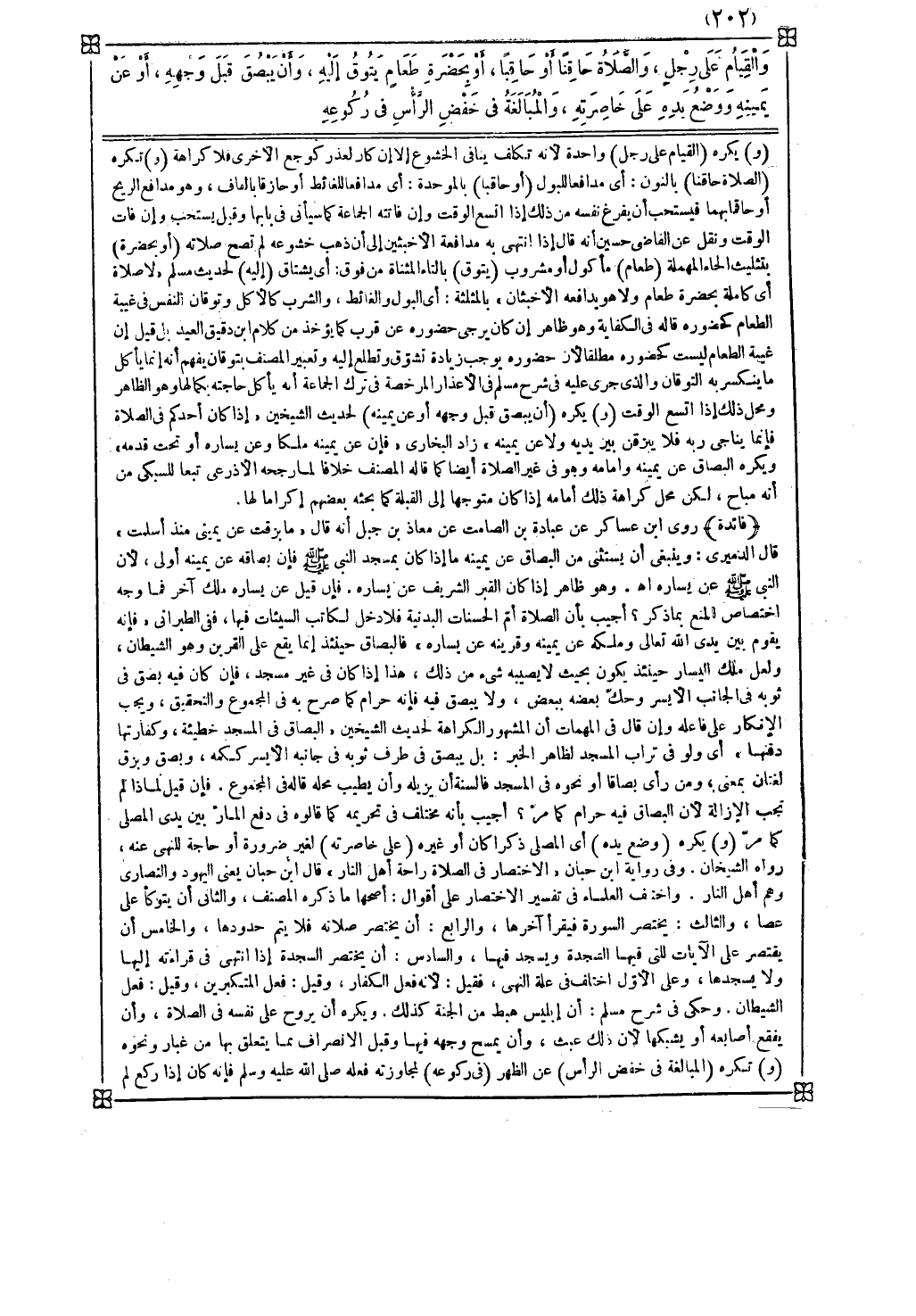 ( و ) تكره ( الصلاة حاقنا ) بالنون : أي مدافعا للبول ( أو حاقبا ) بالموحدة : أي مدافعا للغائط أو حازقا بالقاف : وهو مدافع الريح أو حاقما بهما فيستحب أن يفرغ نفسه من ذلك إذا اتسع الوقت وإن فاتته الجماعة كما سيأتي في بابها