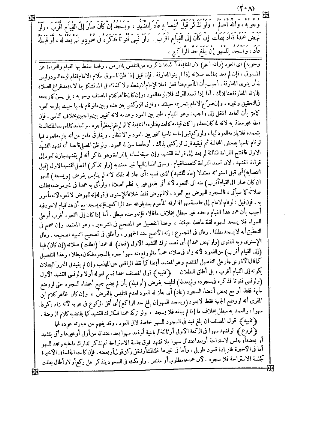 فروع لو تشهد سهوا في الركعة الأولى أو ثالثة الرباعية أو قعد سهوا بعد اعتداله من أولى أو غيرها وأتى بتشهد أو بعضه أو جلس لاستراحة أو بعد اعتدال سهوا بلا تشهد فوق جلسة الاستراحة ثم تذكر تدارك ما عليه وسجد للسهو أما في الأخيرة فلزيادة قعود طويل وأما في غيرها فلذلك أو لنقل ركن قولي أو بعضه