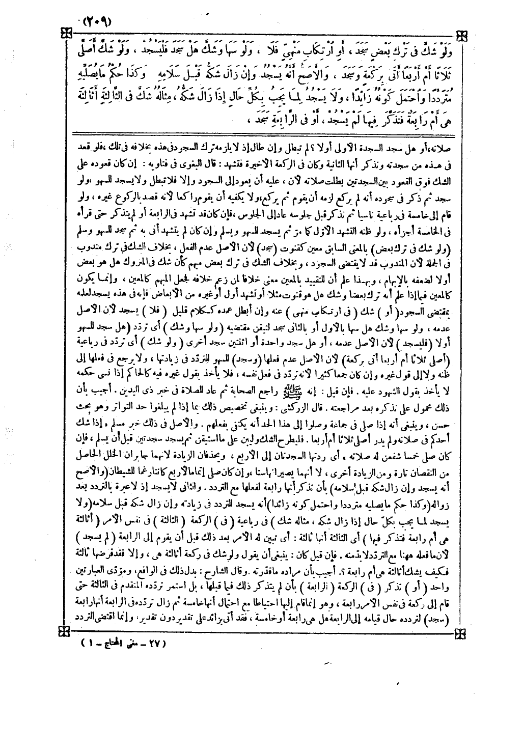 وينبغي أنه إذا صلى في جماعة وصلوا إلى هذا الحد أنه يكتفي بفعلهم والأصل في ذلك خبر مسلم إذا شك أحدكم في صلاته ولم يدر أصلى ثلاثا أم أربعا فليطرح الشك وليبن على ما استيقن ثم يسجد سجدتين قبل أن يسلم فإن كان صلى خمسا شفعن له صلاته أي ردتها السجدتان إلى الأربع ويحذفان الزيادة لأنهما جابران الخلل الحاصل من النقصان تارة ومن الزيادة أخرى لا أنهما يصيرانها ستا