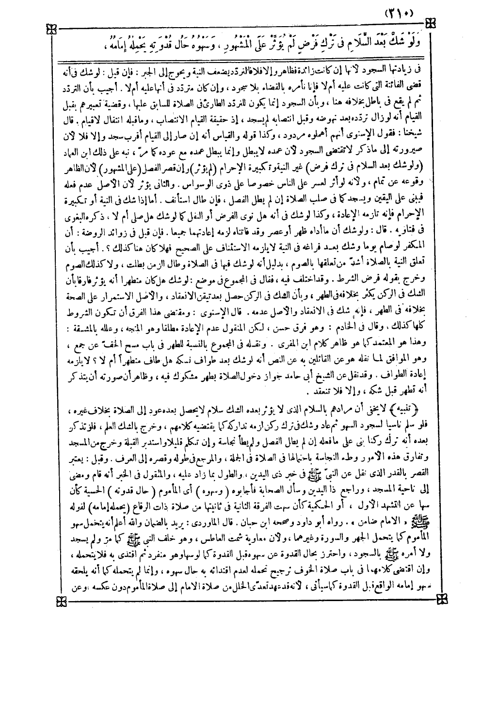 ( وسهوه ) أي المأموم ( حال قدوته ) الحسية كأن سها عن التشهد الأول أو الحكمية كأن سهت الفرقة الثانية في ثانيتها من صلاة ذات الرقاع ( يحمله إمامه ) لقوله صلى الله عليه وسلم الإمام ضامن رواه أبو داود وصححه ابن حبان
