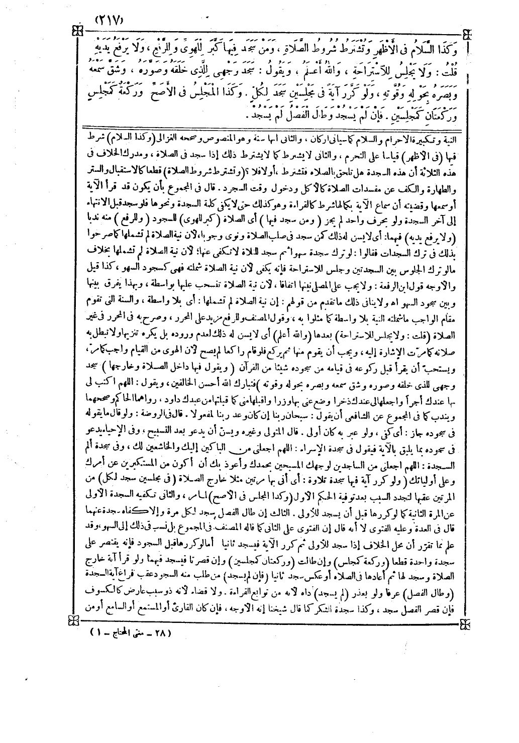 ومدرك الخلاف في هذه الثلاثة أن هذه السجدة هل تلحق بالصلاة فتشترط أو لا فلا (وتشترط شروط الصلاة) قطعا كالاستقبال والستر والطهارة والكف عن مفسدات الصلاة كالأكل ودخول وقت السجود قال في المجموع بأن يكون قد قرأ الآية أو سمعها