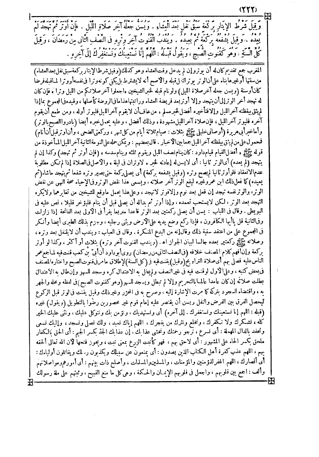 ويجوز فتحها لأن الله تعالى ألحقه بهم اللهم عذب كفرة أهل الكتاب الذين يصدون أي يمنعون عن سبيلك ويكذبون رسلك ويقاتلون أولياءك أي أنصارك اللهم اغفر للمؤمنين والمؤمنات والمسلمين والمسلمات وأصلح ذات بينهم أي أمورهم ومواصلاتهم وألف اجمع بين قلوبهم واجعل في قلوبهم الإيمان والحكمة وهي كل ما منع القبيح وثبتهم على ملة رسولك