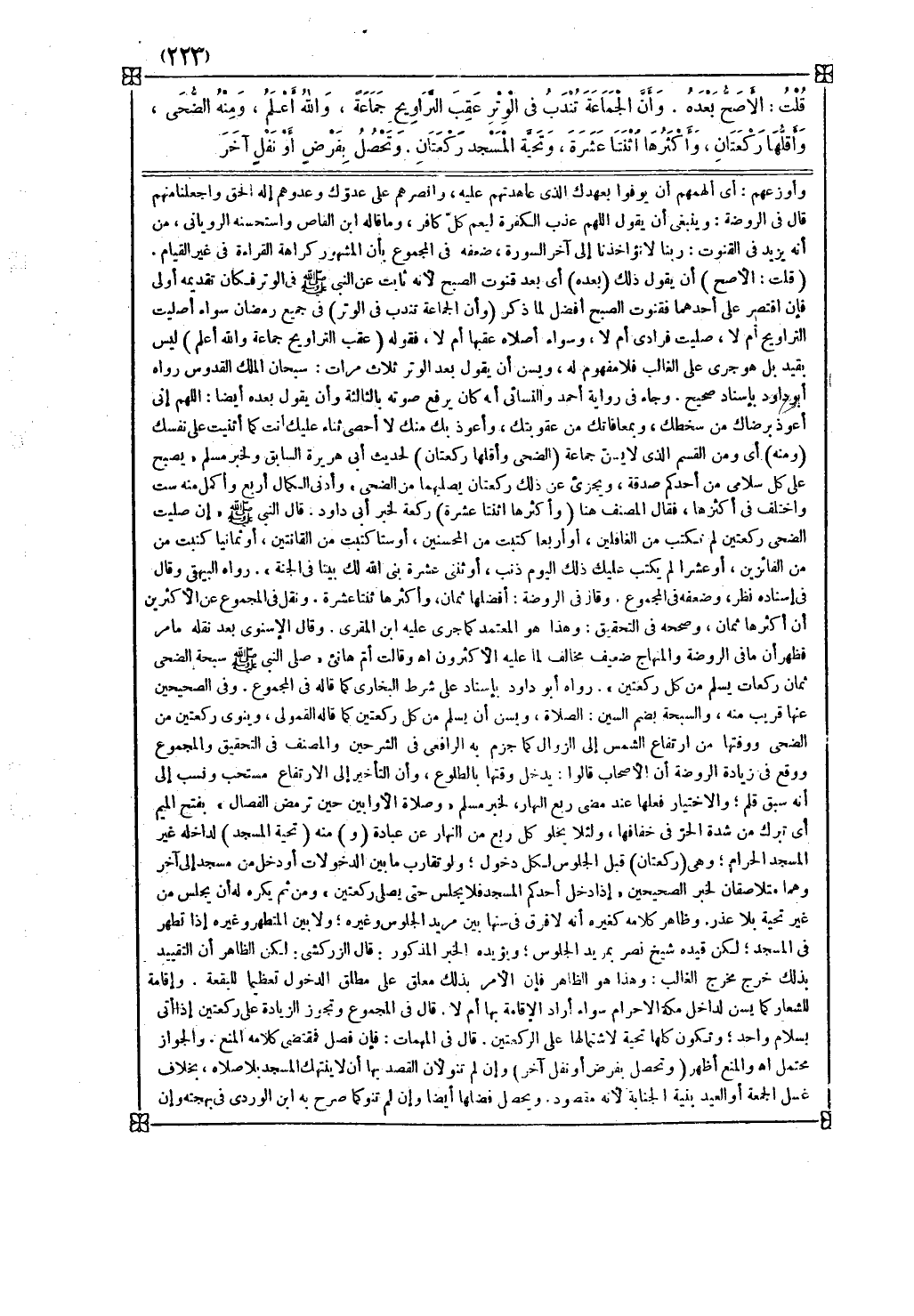 (ومنه) أي ومن القسم الذي لا يسن جماعة (الضحى وأقلها ركعتان) لحديث أبي هريرة السابق ولخبر مسلم يصبح على كل سلامى من أحدكم صدقة ويجزيء عن ذلك ركعتان يصليهما من الضحى