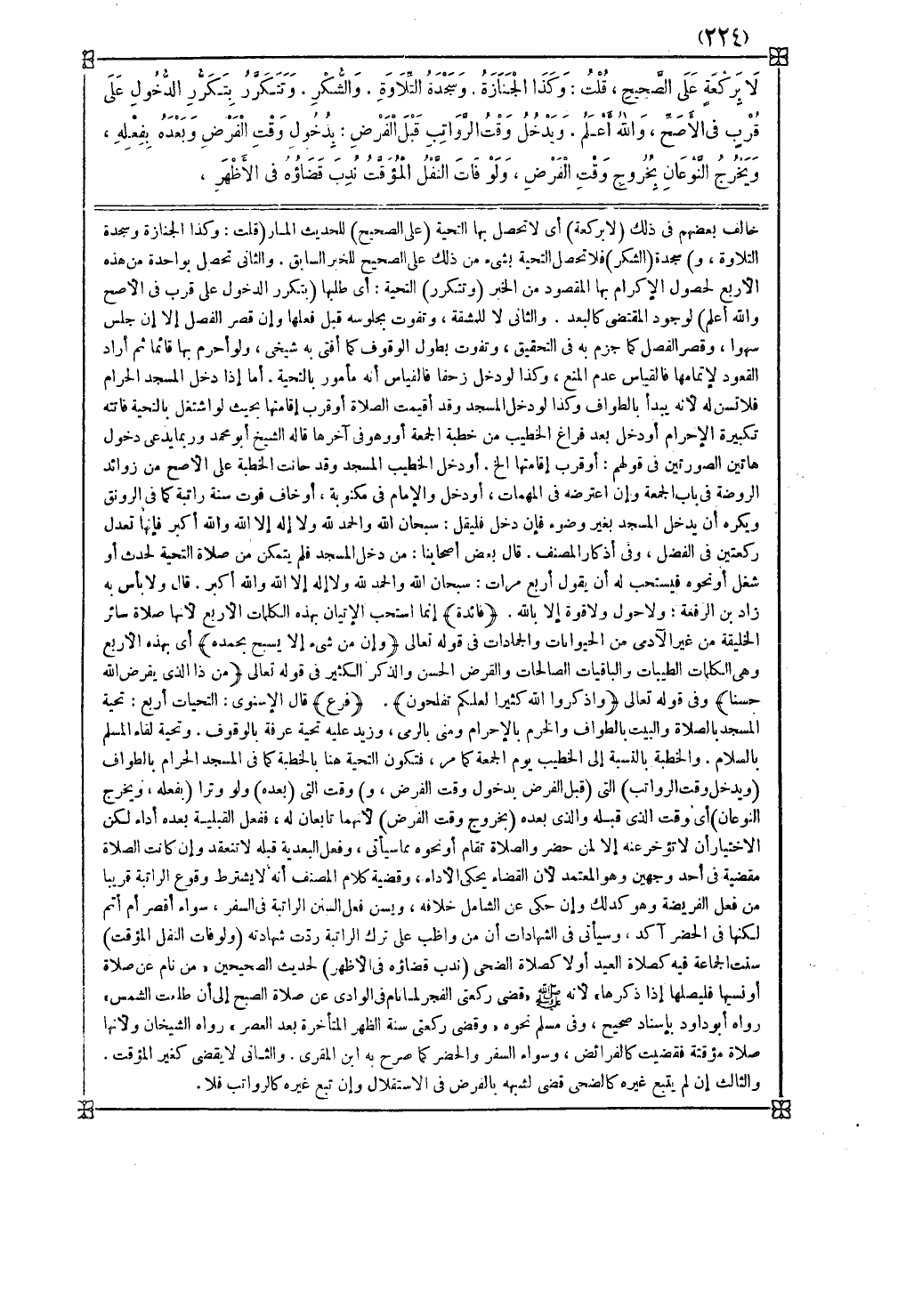 أما إذا دخل المسجد الحرام فلا تسن له لأنه يبدأ بالطواف وكذا لو دخل المسجد وقد أقيمت الصلاة أو قرب إقامتها بحيث لو اشتغل بالتحية فاتته تكبيرة الإحرام أو دخل بعد فراغ الخطيب من خطبة الجمعة أو وهو في آخرها قاله الشيخ أبو محمد