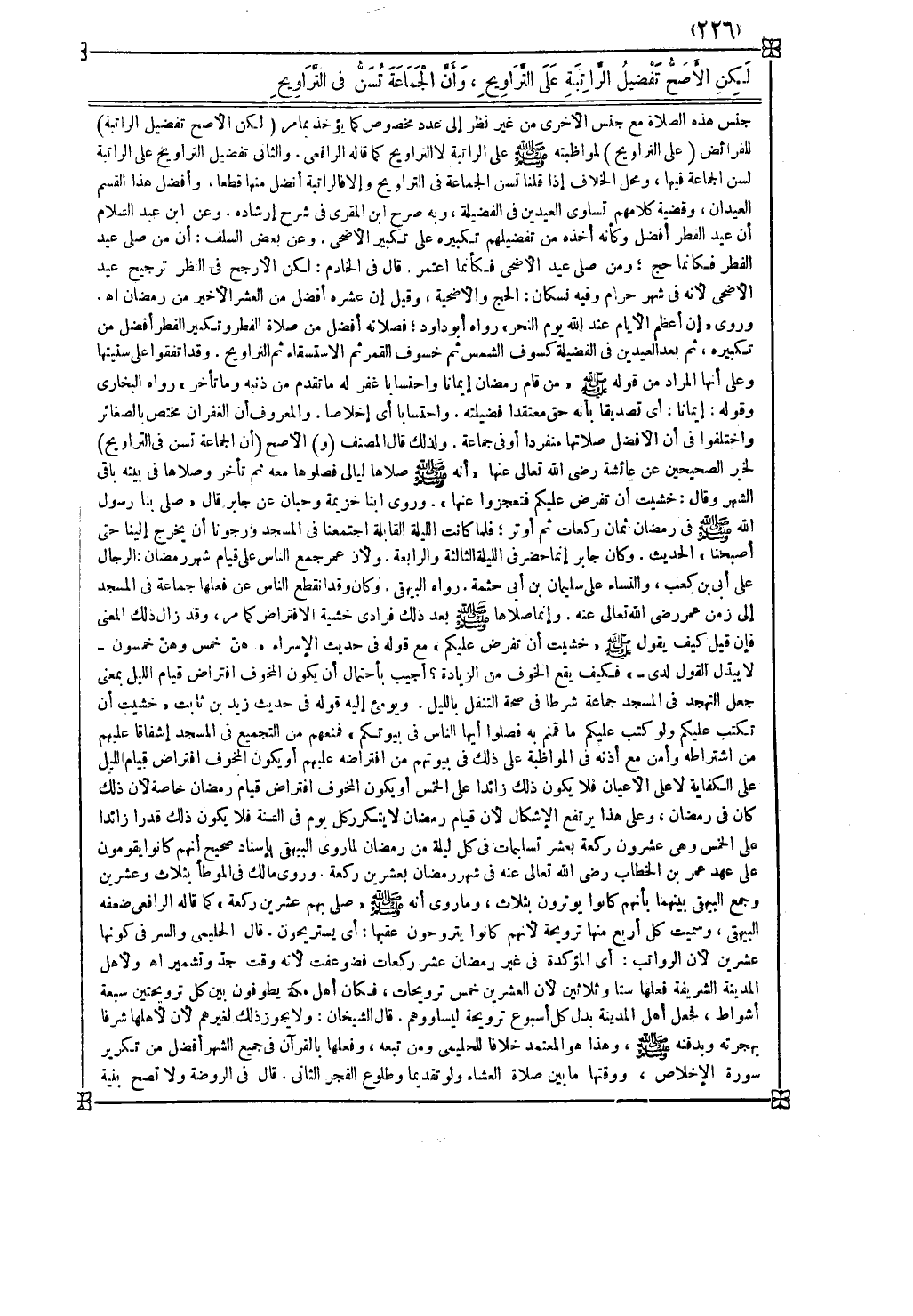 ومحل الخلاف إذا قلنا تسن الجماعة في التراويح وإلا فالراتبة أفضل منها قطعا وأفضل هذا القسم العيدان وقضية كلامهم تساوي العيدين في الفضيلة وبه صرح ابن المقري في شرح إرشاده وعن ابن عبد السلام أن عيد الفطر أفضل وكأنه أخذه من تفضيلهم تكبيره على تكبير الأضحى