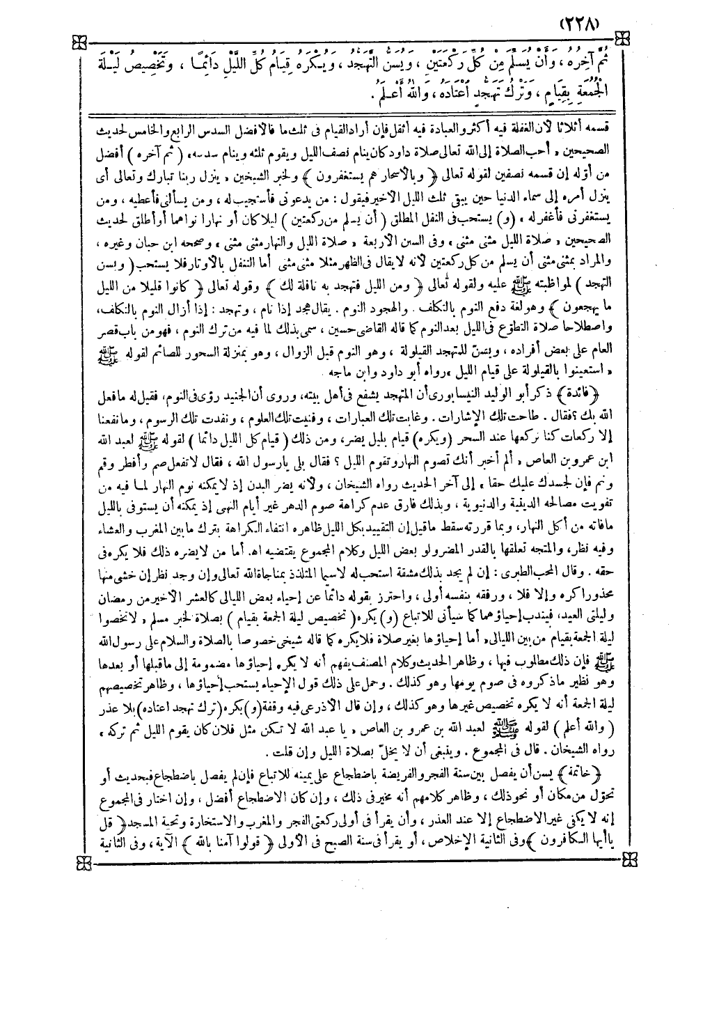 ( و ) يكره ( تخصيص ليلة الجمعة بقيام ) بصلاة لخبر مسلم لا تخصوا ليلة الجمعة بقيام من بين الليالي أما إحياؤها بغير صلاة فلا يكره كما قاله شيخي خصوصا بالصلاة والسلام على رسول الله صلى الله عليه وسلم فإن ذلك مطلوب فيها