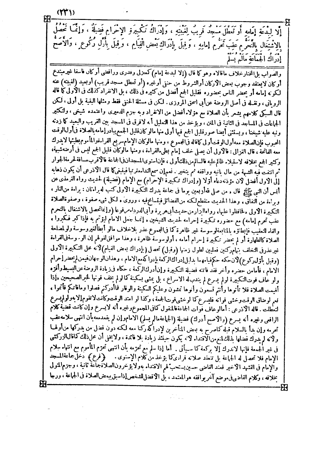 (وإدراك تكبيرة الإحرام) مع الإمام (فضيلة) لحديث رواه الترمذي عن أنس أن النبي صلى الله عليه وسلم قال من صلى لله أربعين يوما في جماعة يدرك التكبيرة الأولى كتب له براءتان براءة من النار وبراءة من النفاق وهذا الحديث منقطع لكنه من الفضائل فيتسامح فيه وروي لكل شيء صفوة وصفوة الصلاة التكبيرة الأولى فحافظوا عليها رواه البزار من حديث أبي هريرة وأبي الدرداء مرفوعا