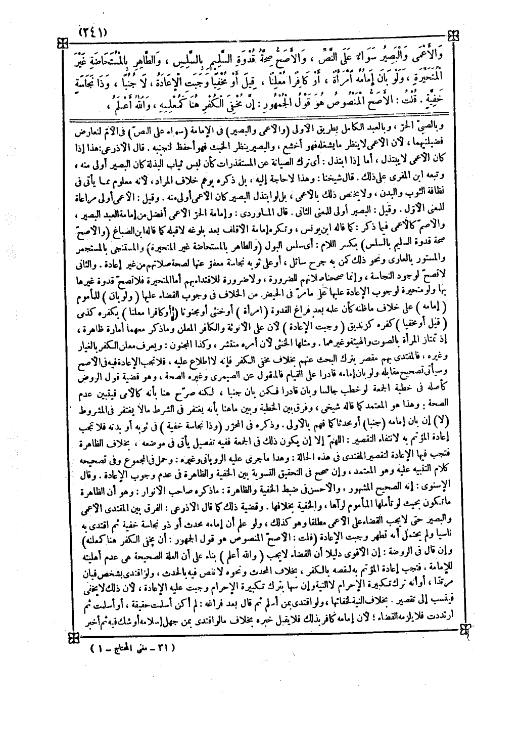 ( والأعمى والبصير ) في الإمامة ( سواء على النص ) في الأم لتعارض فضيلتيهما لأن الأعمى لا ينظر ما يشغله فهو أخشع والبصير ينظر الخبث فهو أحفظ لتجنبه