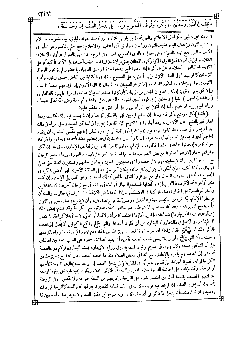 ويسن سد فرج الصفوف وأن لا يشرع في صف حتى يتم الأول وأن يفسح لمن يريده وهذا كله مستحب لا شرط فلو خالفوا صحت صلاتهم مع الكراهة وقد تقدم بعض ذلك