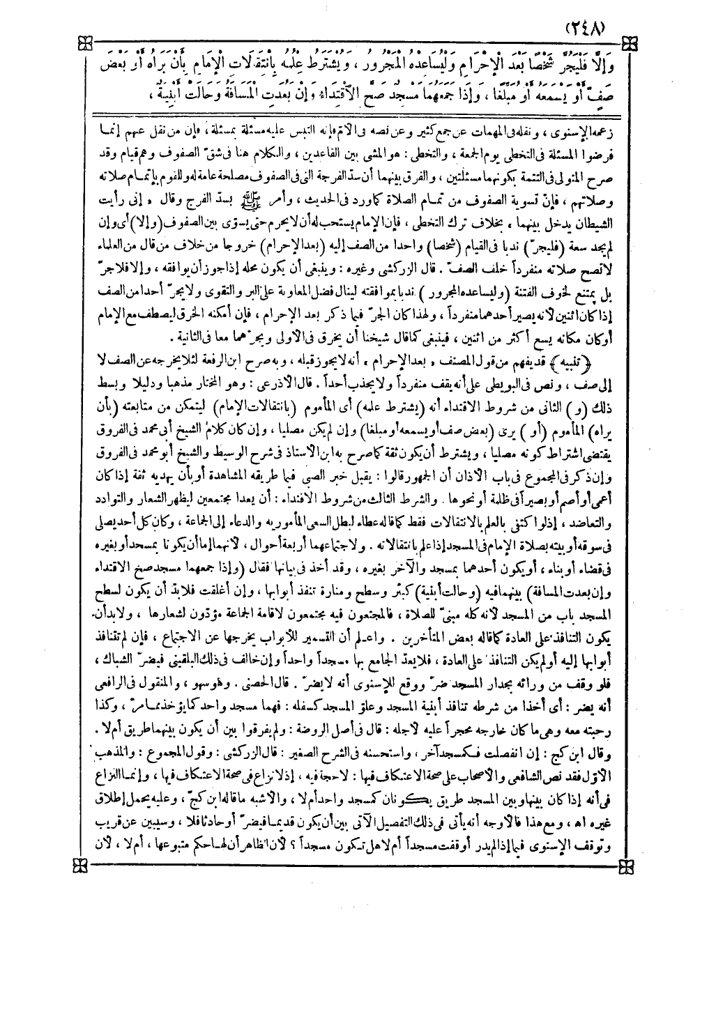فلو وقف من ورائه بجدار المسجد ضر ووقع للإسنوي أنه لا يضر قال الحصني وهو سهو والمنقول في الرافعي أنه يضر أي أخذا من شرطه تنافذ أبنية المسجد وعلو المسجد كسفله فهما مسجد واحد كما يؤخذ مما مر وكذا رحبته معه وهي ما كان خارجه محجرا عليه لأجله قال في أصل الروضة ولم يفرقوا بين أن يكون بينهما طريق أم لا