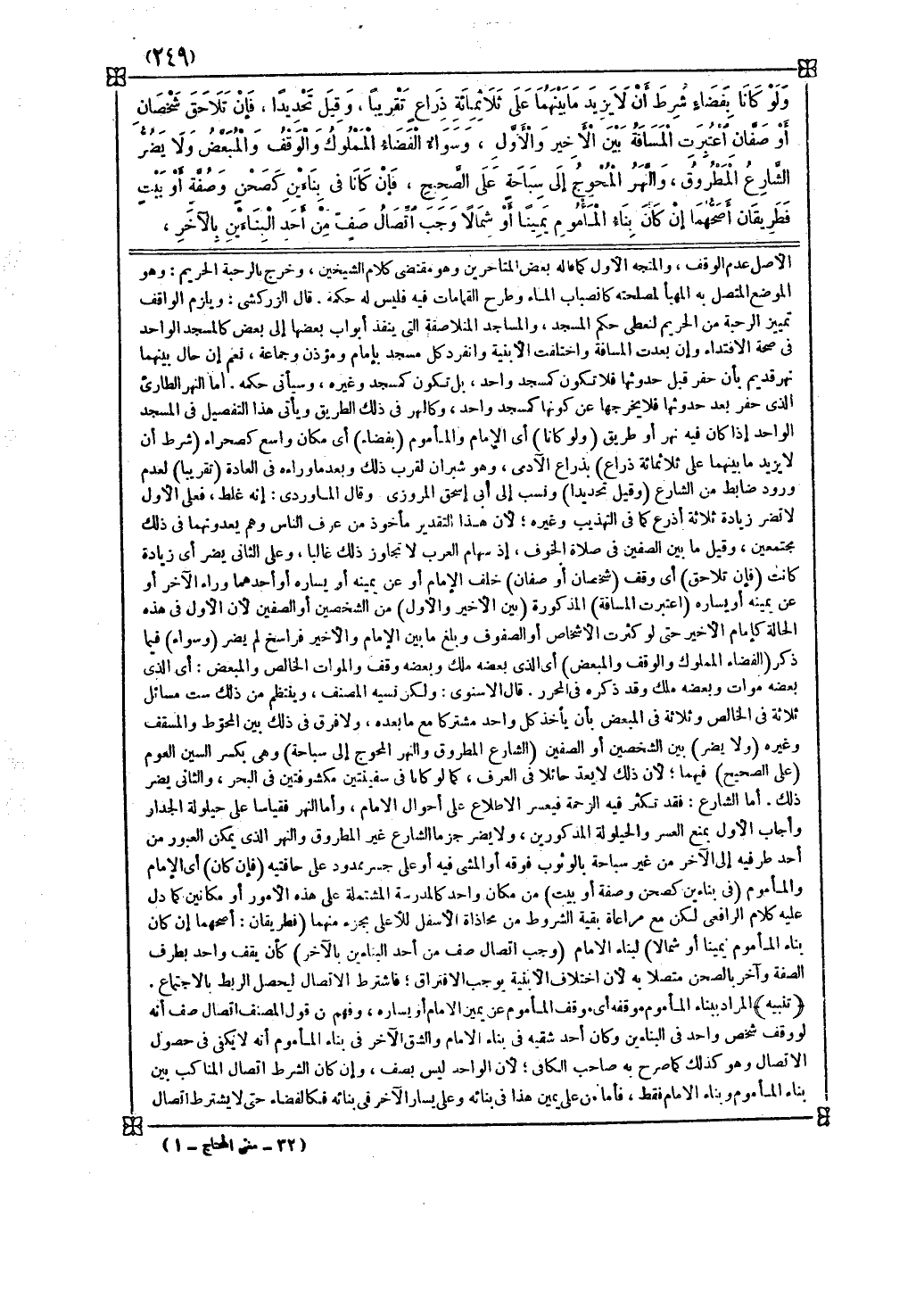 قال الزركشي ويلزم الواقف تمييز الرحبة من الحريم لتعطي حكم المسجد والمساجد المتلاصقة التي ينفذ أبواب بعضها إلى بعض كالمسجد الواحد في صحة الاقتداء وإن بعدت المسافة واختلفت الأبنية وانفرد كل مسجد بإمام ومؤذن وجماعة نعم إن حال بينهما نهر قديم بأن حفر قبل حدوثها فلا تكون كمسجد واحد بل تكون كمسجد وغيره وسيأتي حكمه