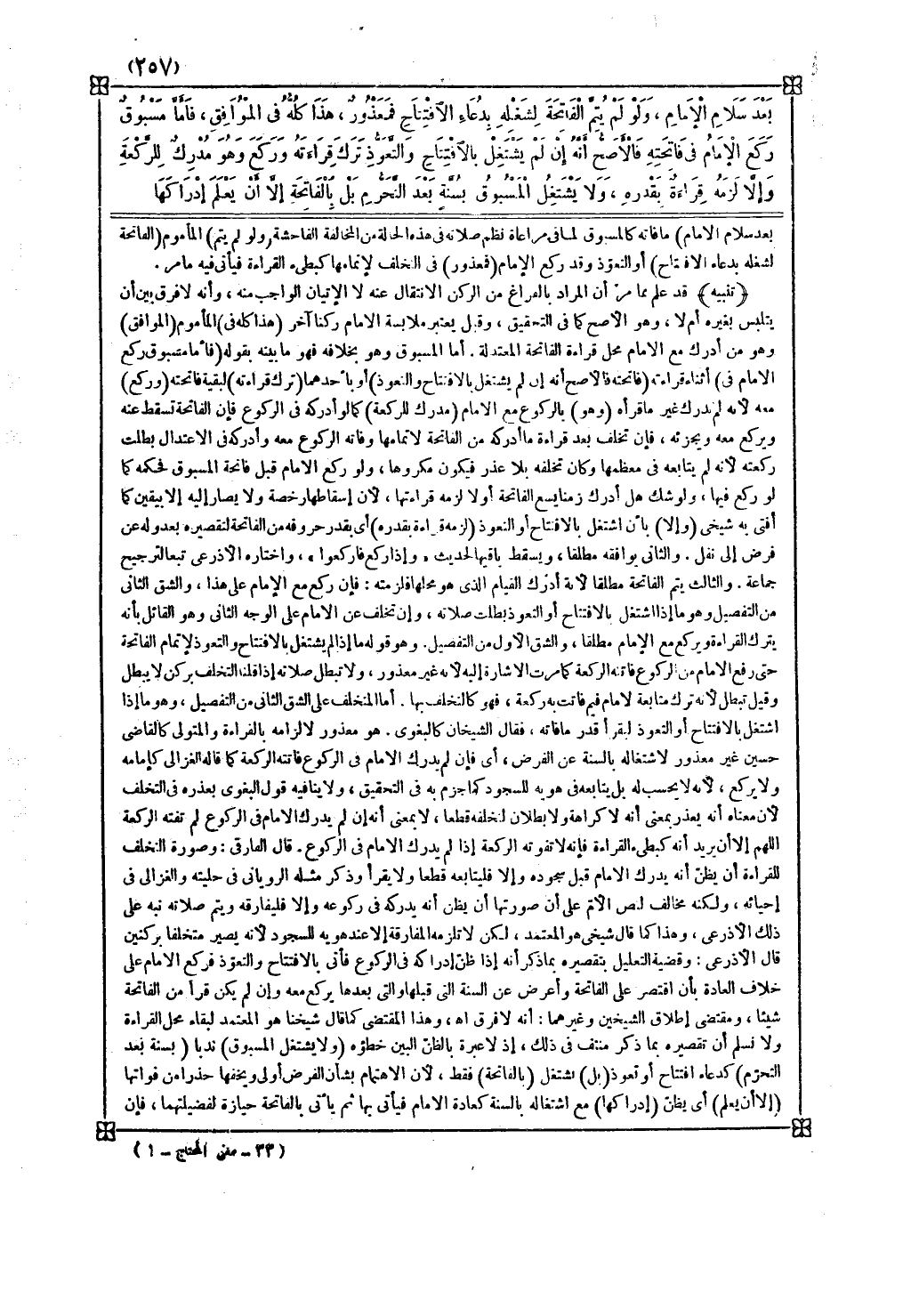 ( ولا يشتغل المسبوق ) ندبا ( بسنة بعد التحرم ) كدعاء افتتاح أو تعوذ ( بل ) يشتغل ( بالفاتحة ) فقط لأن الاهتمام بشأن الفرض أولى ويخفها حذرا من فواتها ( إلا أن يعلم ) أي يظن ( إدراكها ) مع اشتغاله بالسنة كعادة الإمام فيأتي بها ثم يأتي بالفاتحة حيازة لفضيلتهما فإن