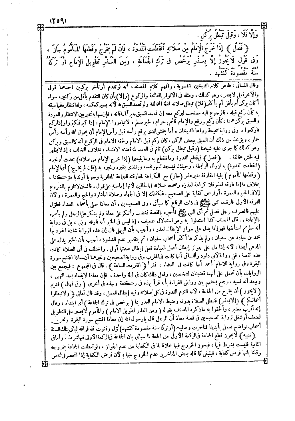 تنبيه لا يجوز قطع الجماعة في الركعة الأولى من الجمعة لما سيأتي بأن الجماعة في الركعة الأولى فيها شرط وأما في الثانية فليست بشرط فيها فيجوز الخروج فيها خلافا لما في الكفاية من عدم الجواز ولو تعطلت الجماعة بخروجه وقلنا بأنها فرض كفاية فينبغي كما قاله بعض المتأخرين عدم الخروج منها لأن فرض الكفاية إذا انحصر في شخص تعين