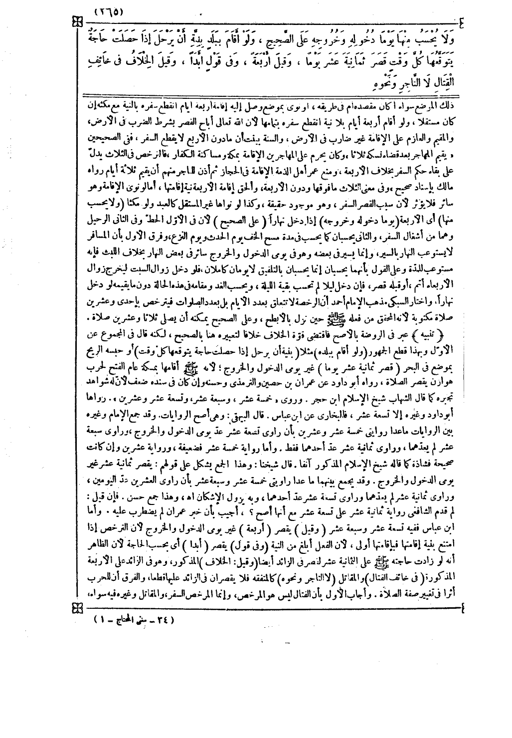 واختار السبكي مذهب الإمام أحمد أن الرخصة لا تتعلق بعدد الأيام بل بعدد الصلوات فيترخص بإحدى وعشرين صلاة مكتوبة لأنه المحقق من فعله صلى الله عليه وسلم حين نزل بالأبطح وعلى الصحيح يمكنه أن يصلي ثلاثا وعشرين صلاة