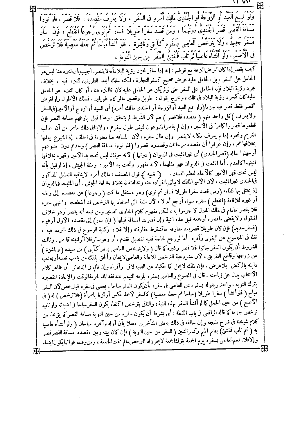 ( فلو أنشأ ) سفرا طويلا ( مباحا ثم جعله معصية ) كالسفر لأخذ مكس أو للزنا بامرأة ( فلا ترخص ) له ( في الأصح ) من حين الجعل كما لو أنشأ السفر بهذه النية