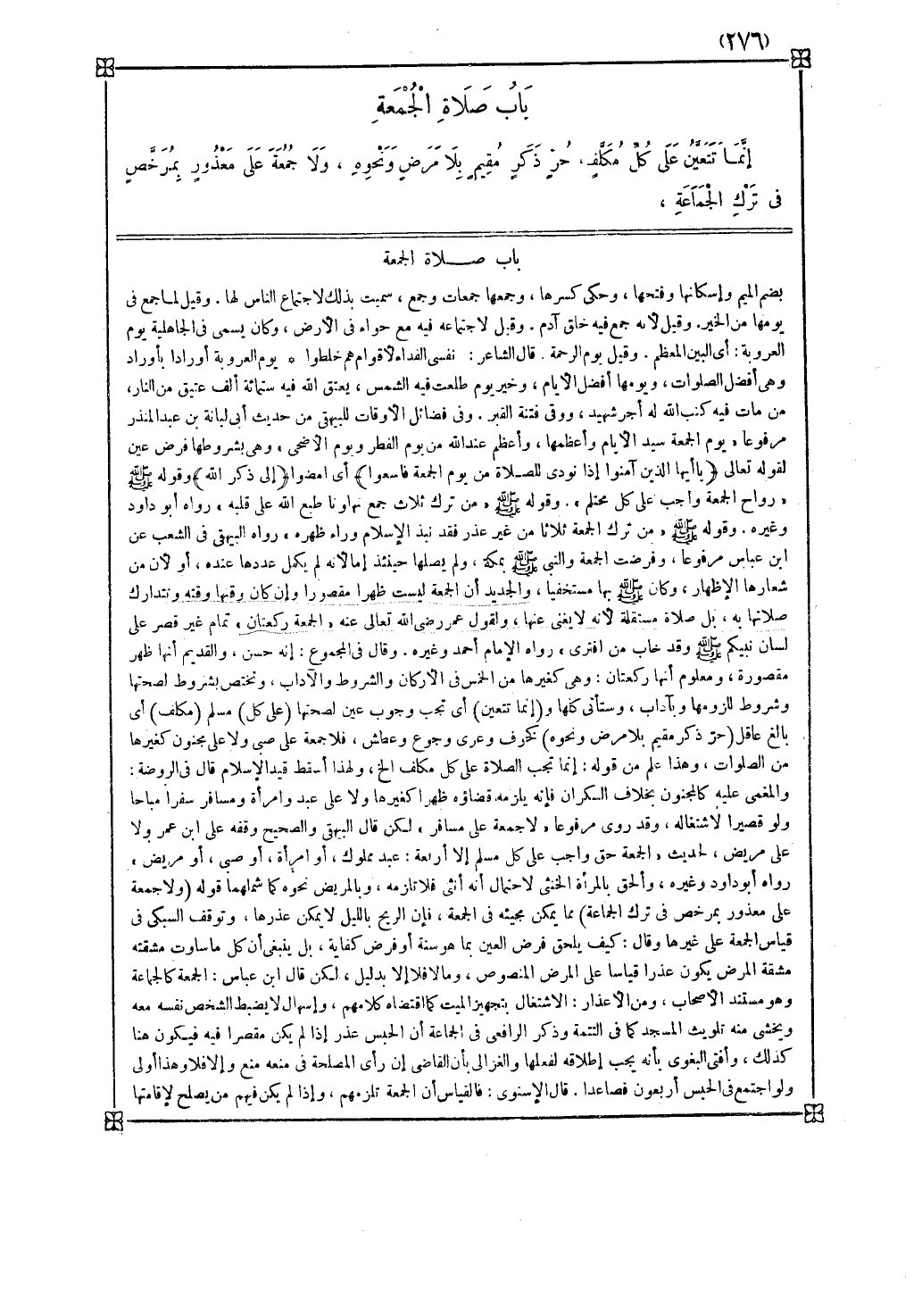 باب صلاة الجمعة بضم الميم وإسكانها وفتحها وحكى كسرها وجمعها جمعات وجمع سميت بذلك لاجتماع الناس لها وقيل لما جمع في يومها من الخير وقيل لأنه جمع فيه خلق آدم وقيل لاجتماعه فيه مع حواء في الأرض