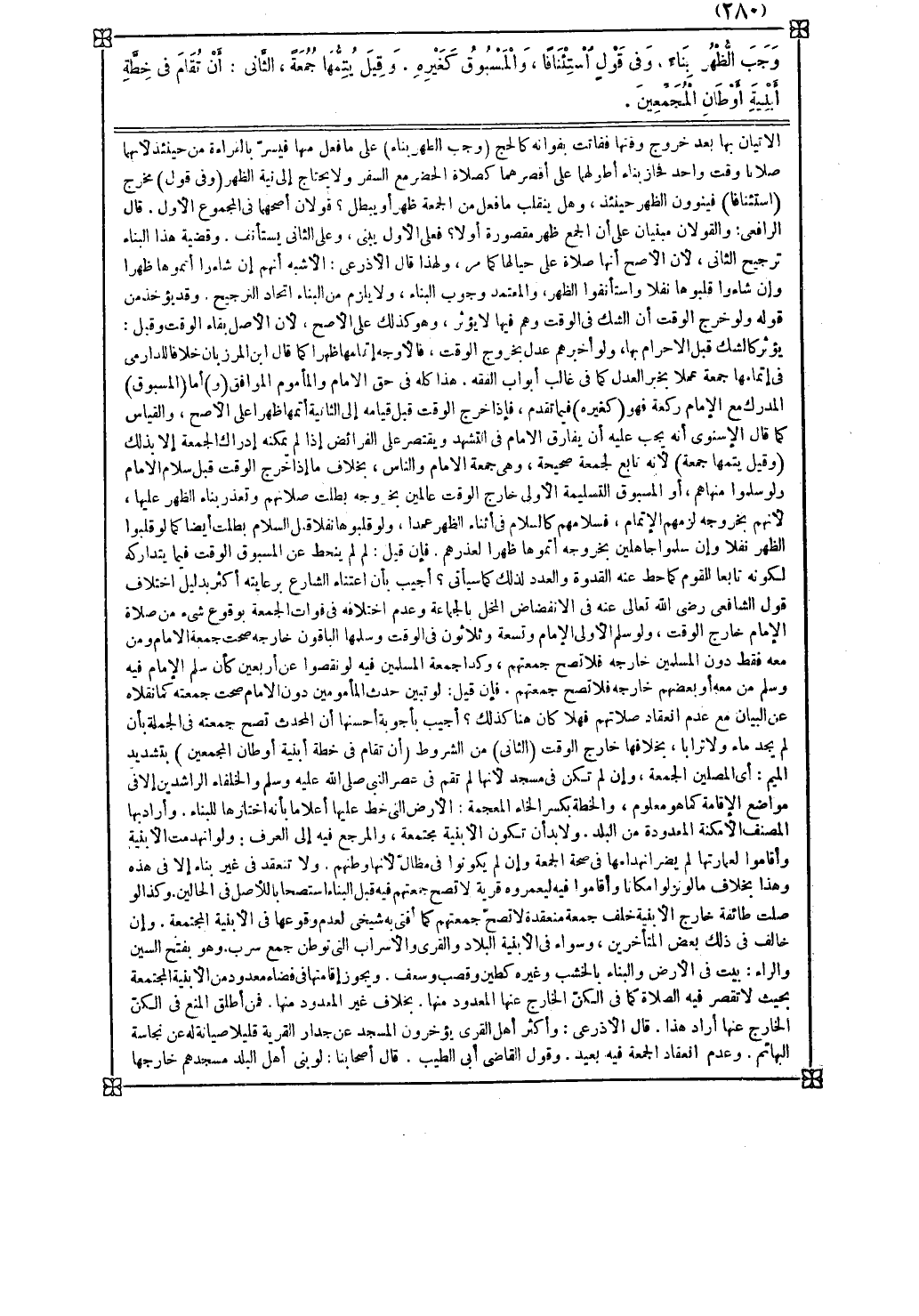 ( الثاني ) من الشروط ( أن تقام في خطة أبنية أوطان المجمعين ) بتشديد الميم أي المصلين الجمعة وإن لم تكن في مسجد لأنها لم تقم في عصر النبي صلى الله عليه وسلم والخلفاء الراشدين إلا في مواضع الإقامة كما هو معلوم