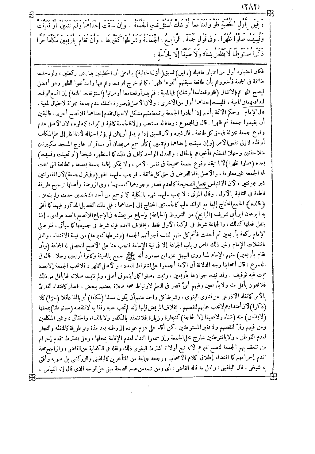 قال في المجموع قال أصحابنا وجه الدلالة أن الأمة أجمعوا على اشتراط العدد والأصل الظهر فلا تجب الجمعة إلا بعدد ثبت فيه توقيف وقد ثبت جوازها بأربعين وثبت صلوا كما رأيتموني أصلي ولم تثبت صلاته لها بأقل من ذلك فلا تجوز بأقل منه ولا بأربعين وفيهم أمي قصر في التعلم لارتباط صحة صلاة بعضهم ببعض فصار كاقتداء القارىء بالأمي كما نقله الأذرعي عن فتاوى البغوي