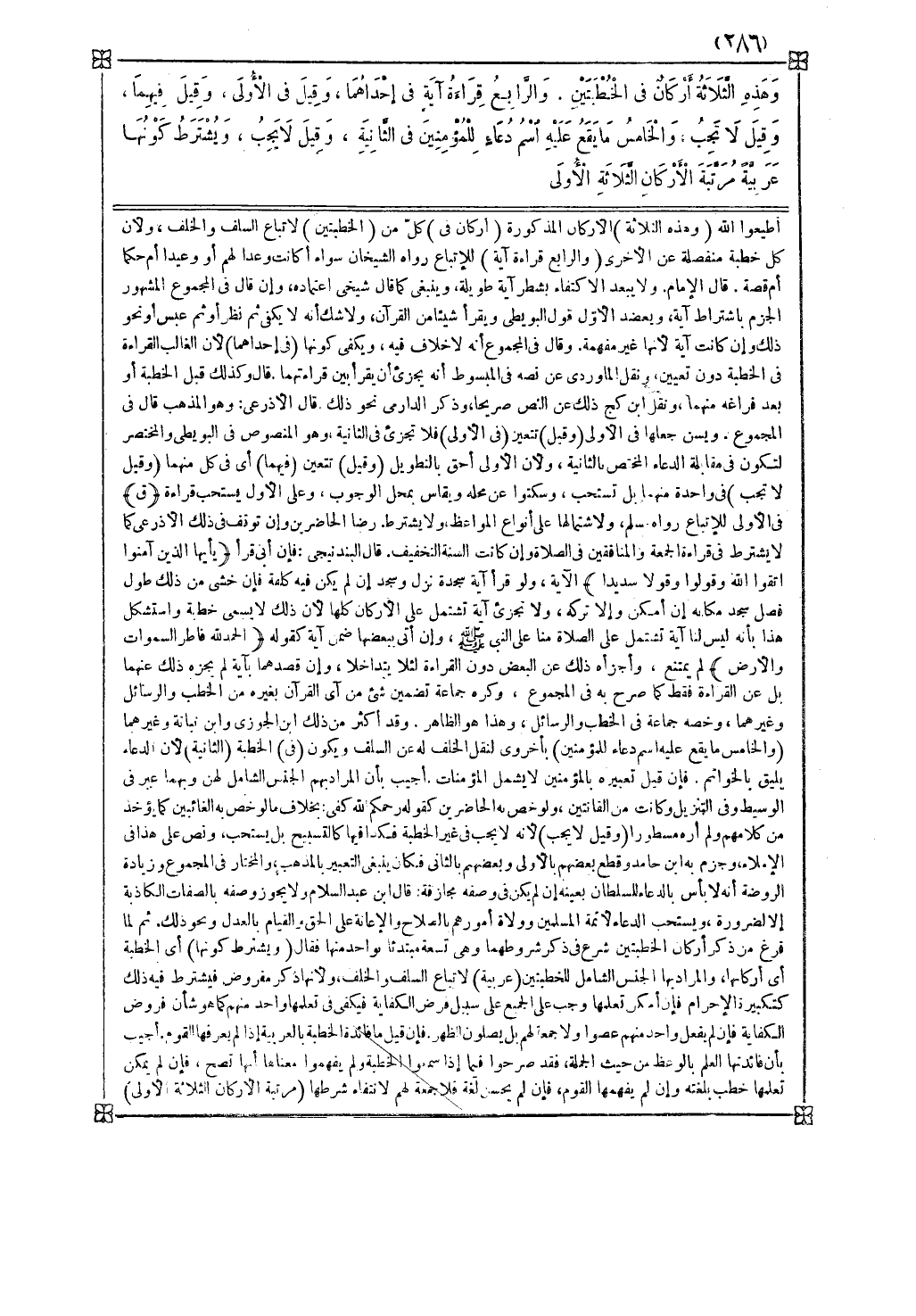 ثم لما فرغ من ذكر أركان الخطبتين شرع في ذكر شروطهما وهي تسعة مبتدئا بواحد منها فقال ( ويشترط كونها ) أي الخطبة أي أركانها والمراد بها الجنس الشامل للخطبتين ( عربية ) لاتباع السلف والخلف ولأنها ذكر مفروض فيشترط فيه ذلك كتكبيرة الإحرام فإن أمكن تعلمها وجب على الجميع على سبيل فرض الكفاية فيكفي في تعلمها واحد منهم كما هو شأن فروض الكفاية فإن لم يفعل واحد منهم عصوا ولا جمعة لهم بل يصلون الظهر