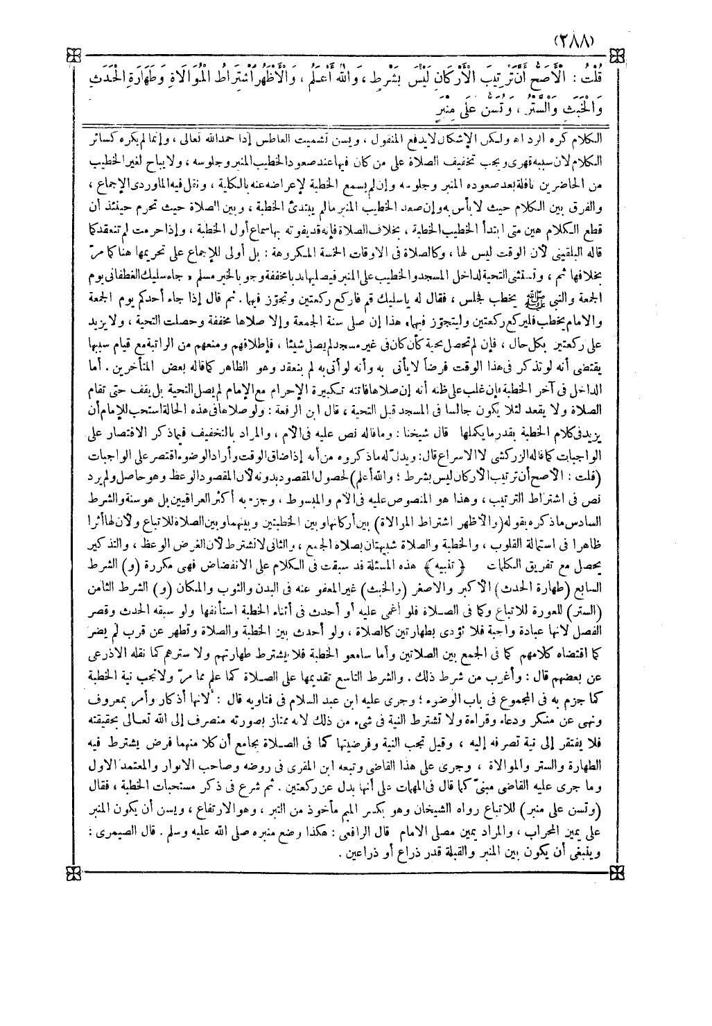 ( قلت الأصح أن ترتيب الأركان ليس بشرط والله أعلم ) لحصول المقصود بدونه لأن المقصود الوعظ وهو حاصل ولم يرد نص في اشتراط الترتيب وهذا هو المنصوص عليه في الأم والمبسوط وجزم به أكثر العراقيين بل هو سنة