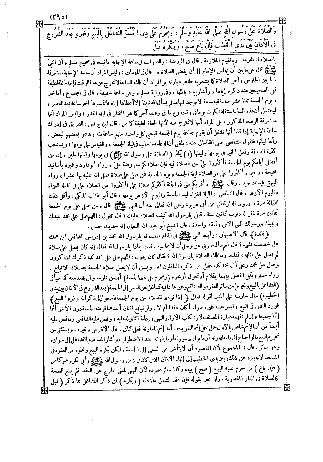 وأشار المصنف بالتشاغل إلى جوازه وهو سائر قال في المجموع لأن المقصود أن لا يتأخر عن السعي إلى الجمعة لكن يكره البيع ونحوه من العقود في المسجد لأنه ينزه عن ذلك وبين يدي الخطيب إلى إنهاء الأذان الذي كان في زمن رسول الله صلى الله عليه وسلم وأبي بكر وعمر كما مر