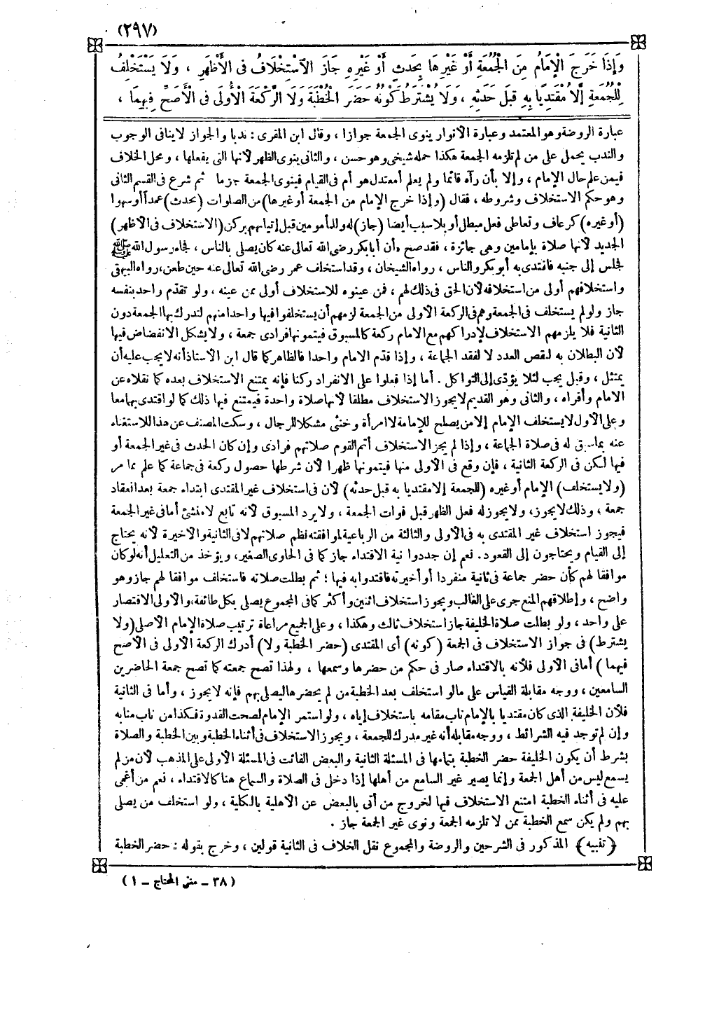 ثم شرع في القسم الثاني وهو حكم الاستخلاف وشروطه فقال ( وإذا خرج الإمام من الجمعة أو غيرها ) من الصلوات ( بحدث ) عمدا أو سهوا ( أو غيره ) كرعاف وتعاطي فعل مبطل أو بلا سبب أيضا ( جاز ) له وللمأمومين قبل إتيانهم بركن ( الاستخلاف في الأظهر ) الجديد لأنها صلاة بإمامين وهي جائزة فقد صح أن أبا بكر رضي الله تعالى عنه كان يصلي بالناس فجاء رسول الله صلى الله عليه وسلم فجلس إلى جنبه فاقتدى به أبو بكر والناس رواه الشيخان وقد استخلف عمر رضي الله تعالى عنه حين طعن رواه البيهقي