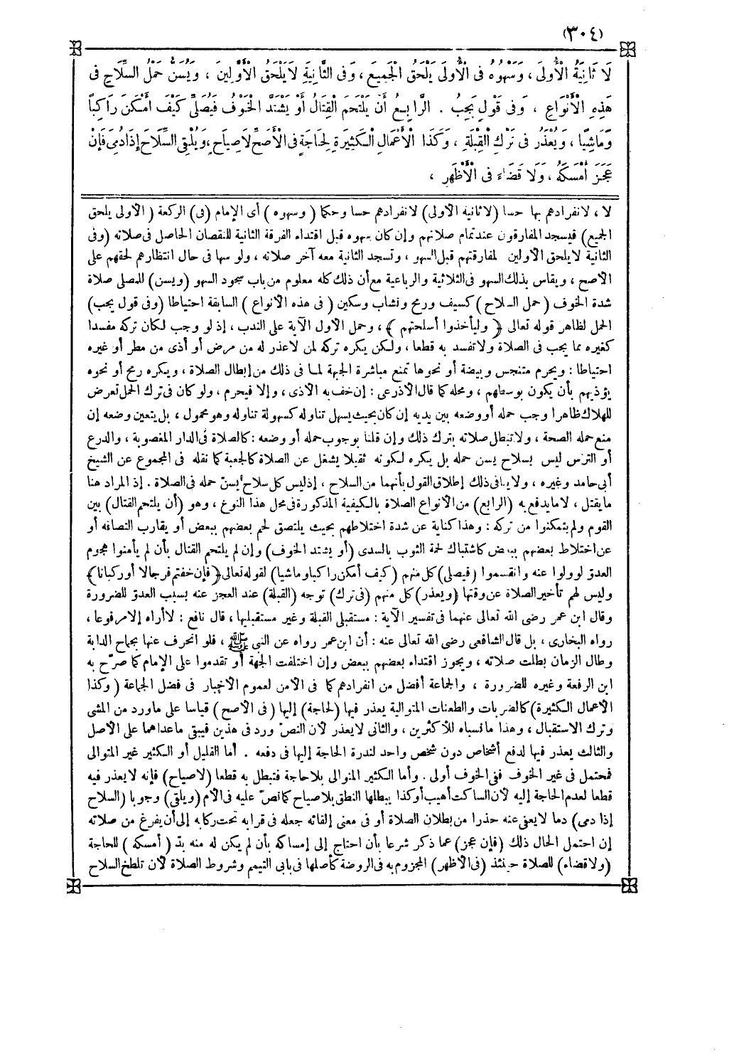 ( ويسن ) للمصلي صلاة شدة الخوف ( حمل السلاح ) كسيف ورمح ونشاب وسكين ( في هذه الأنواع ) السابقة احتياطا ( وفي قول يجب ) الحمل لظاهر قوله تعالى { وليأخذوا أسلحتهم }