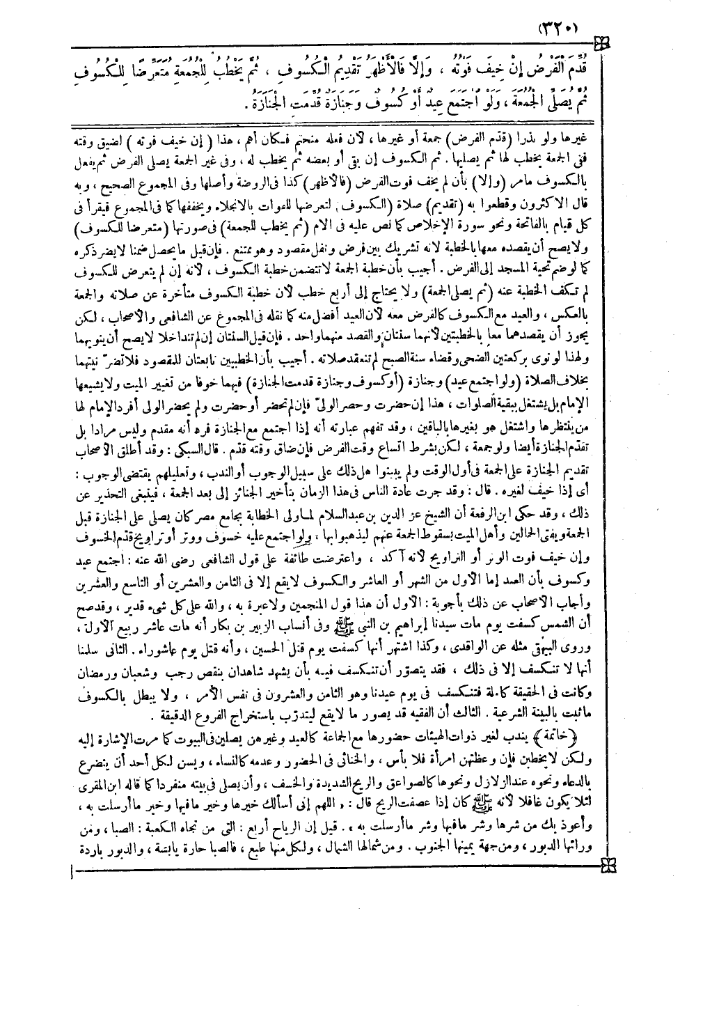 وقد حكى ابن الرفعة أن الشيخ عز الدين بن عبد السلام لما ولي الخطابة بجامع مصر كان يصلي على الجنازة قبل الجمعة ويفتي الحمالين وأهل الميت بسقوط الجمعة عنهم ليذهبوا بها ولو اجتمع عليه خسوف ووتر أو تراويح قدم الخسوف وإن خيف فوت الوتر أو التراويح لأنه آكد