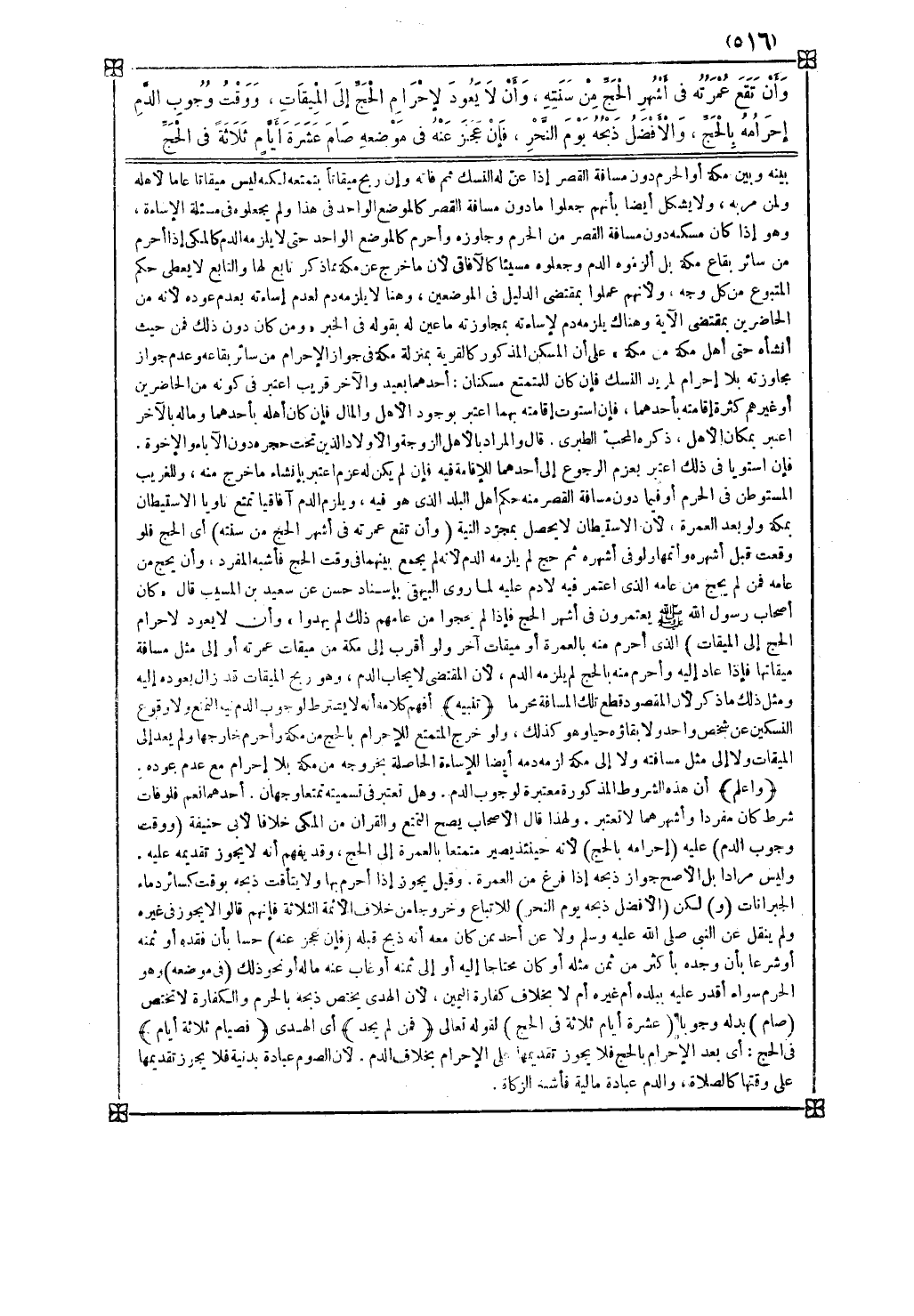 ولا يشكل أيضا بأنهم جعلوا ما دون مسافة القصر كالموضع الواحد في هذا ولم يجعلوه في مسألة الإساءة وهو إذا كان مسكنه دون مسافة القصر من الحرم وجاوزه وأحرم كالموضع الواحد حتى لا يلزمه الدم كالمكي إذا أحرم من سائر بقاع مكة بل ألزموه الدم وجعلوه مسيئا كالآفاقي لأن ما خرج عن مكة مما ذكر تابع لها والتابع لا يعطى حكم المتبوع من كل وجه ولأنهم عملوا بمقتضى الدليل في الموضعين وهنا لا يلزمه دم لعدم إساءته بعدم عوده لأنه من الحاضرين بمقتضى الآية وهناك يلزمه دم لإساءته بمجاوزته ما عين له بقوله في الخبر ومن كان دون ذلك فمن حيث أنشأه حتى أهل مكة من مكة