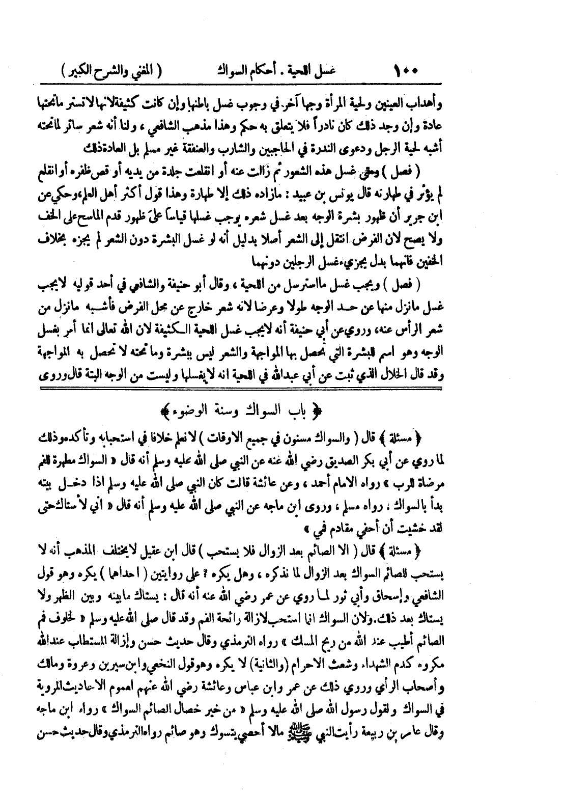 (باب السواك وسنة الوضوء) (مسألة) قال (والسواك مسنون في جميع الأوقات) لا نعلم خلافاً في استحبابه وتأكده وذلك لما روى عن أبي بكر الصديق رضي الله عن النبي صلى الله عليه وسلم أنه قال " السواك مطهرة للفم مرضاة للرب " رواه الإمام أحمد، وعن عائشة قالت كان النبي صلى الله عليه وسلم إذا دخل بيته