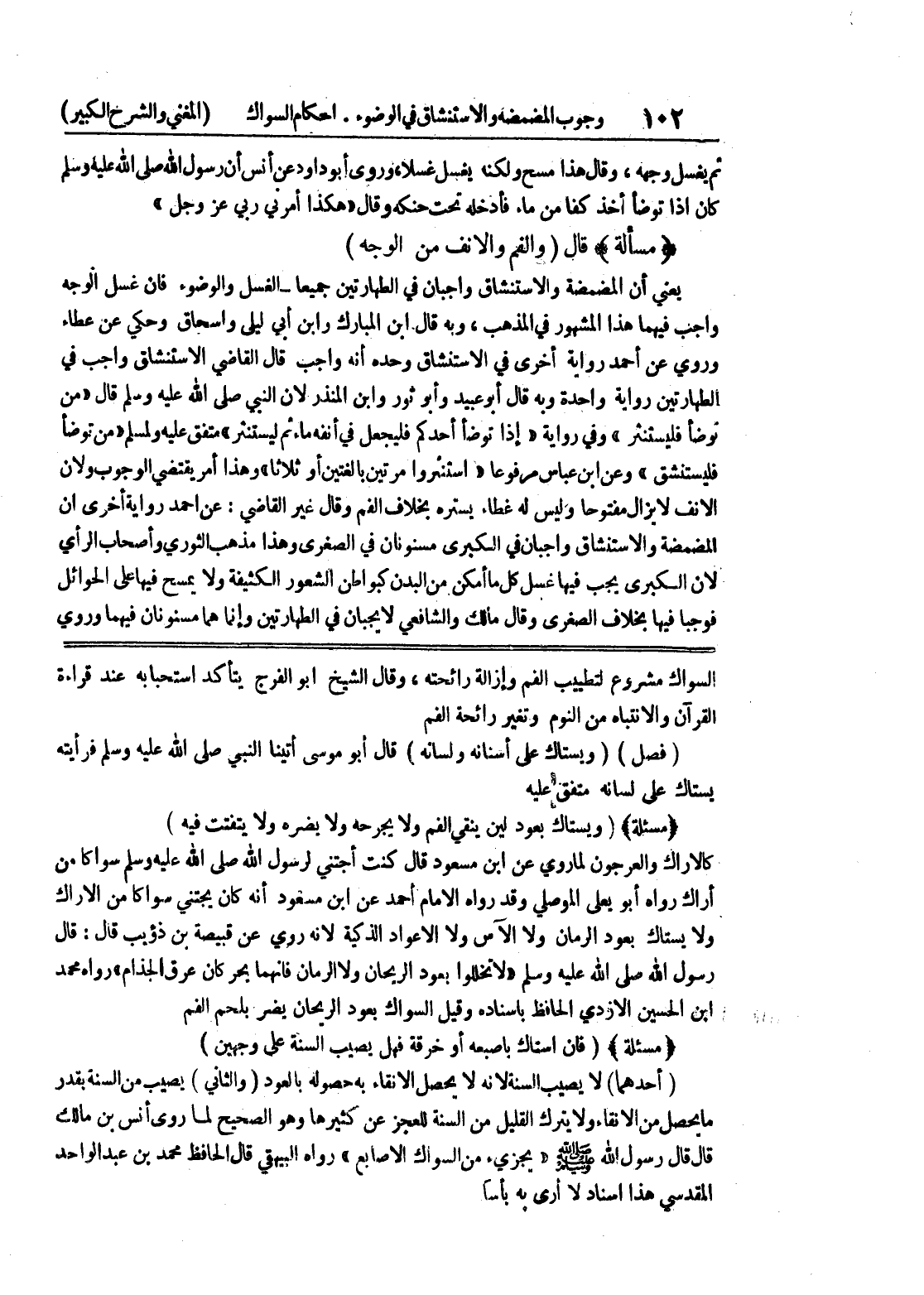 السواك مشروع لتطييب الفم وإزالة رائحته، وقال الشيخ أبو الفرج يتأكد استحبابه عند قراءة القرآن والانتباه من النوم وتغير رائحة الفم (فصل) (ويستاك على أسنانه ولسانه) قال أبو موسى أتينا النبي صلى الله عليه وسلم فرأيته يستاك على لسانه متفق عليه (مسألة) (ويستاك بعود لين ينقي الفم ولا يجرحه ولا يضره ولا يتفتت فيه) كالأراك والعرجون لما روي عن ابن مسعود قال كنت أجتني لرسول الله صلى الله عليه وسلم سواكا من أراك رواه أبو يعلى الموصلي وقد رواه الإمام أحمد عن ابن مسعود أنه كان يجتني سواكا من الأراك ولا يستاك بعود الرمان ولا الآس ولا الأعواد الذكية لأنه روي عن قبيصة بن ذؤيب قال: قال رسول الله صلى الله عليه وسلم " لا تخللوا بعود الريحان ولا الرمان فإنهما يحركان عرق الجذام " رواه محمد ابن الحسين الأزدي الحافظ بإسناده وقيل السواك يعود الريحان يضر بلحم الفم (مسألة) (فإن استاك بأصبعه أو خرقة فهل يصيب السنة على وجهين) (أحدهما) لا يصيب السنة لأنه لا يحصل الإنقاء به حصوله بالعود (والثاني) يصيب من السنة بقدر ما يحصل من الإنقاء ولا يترك القليل من السنة للعجز عن كثيرها وهو الصحيح لما روى أنس بن مالك قال قال رسول الله صلى الله عليه وسلم " يجزئ من السواك الأصابع " رواه البيهقي قال الحافظ محمد بن عبد الواحد المقدسي هذا إسناد لا أرى به بأسا