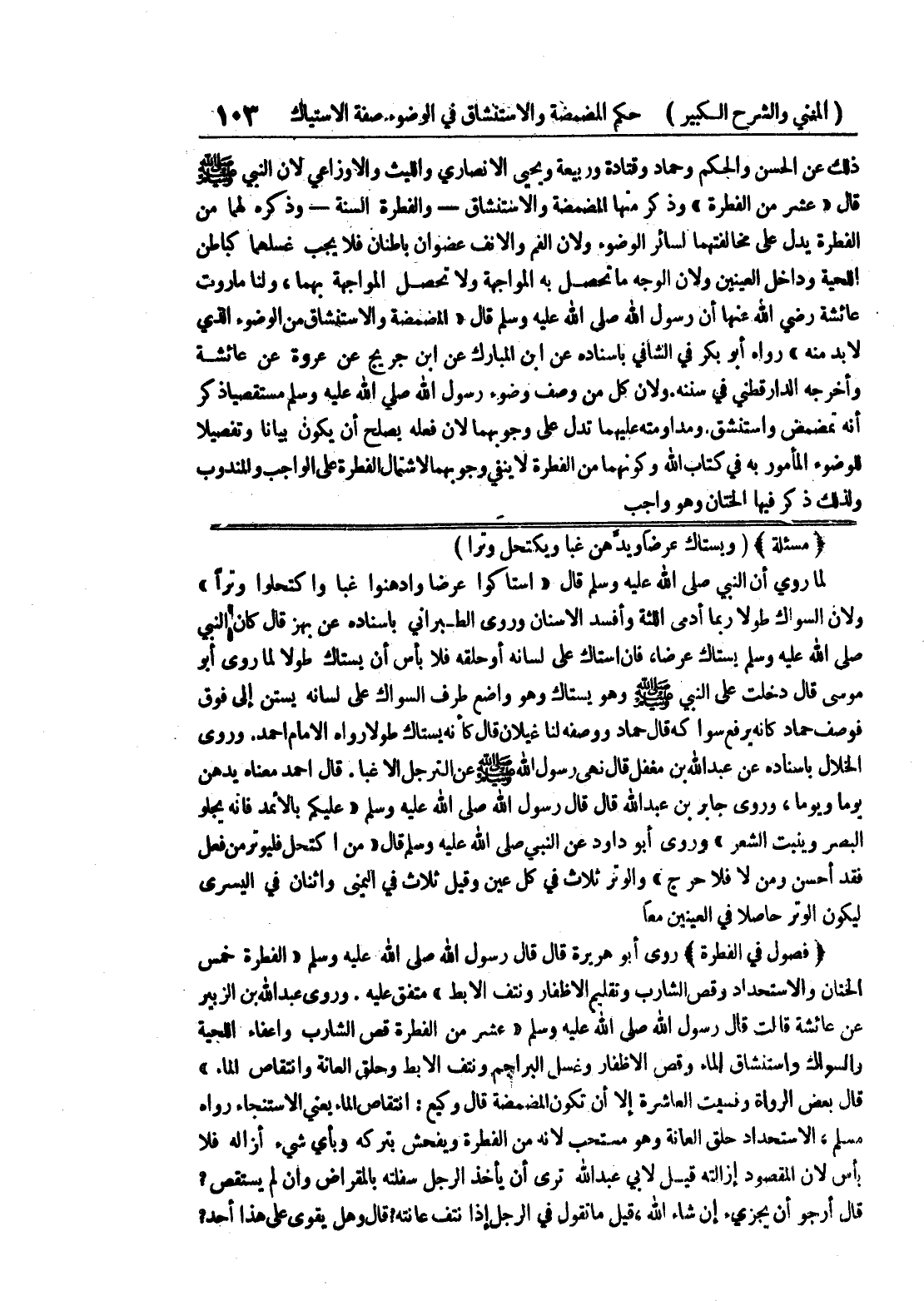 وروى عبد الله بن الزبير عن عائشة قالت قال رسول الله صلى الله عليه وسلم " عشر من الفطرة قص الشارب وإعفاء اللحية والسواك واستنشاق الماء وقص الاظفار وغسل البراجم ونتف الأبط وحلق العانة وانتقاص الماء " قال بعض الرواة ونسيت العاشرة إلا أن تكون المضمضة قال وكيع: انتقاص الماء يعني الاستنجاء رواه مسلم، الاستحداد حلق العانة وهو مستحب لأنه من الفطرة ويفحش بتركه وبأي شئ أزاله فلا بأس لأن المقصود إزالته قيل لأبي عبد الله ترى أن يأخذ الرجل سفلته بالمقراض وإن لم يستقص؟ قال أرجو أن يجزئ إن شاء الله، قيل ما تقول في الرجل إذا نتف عانته؟ قال وهل يقوى على هذا أحد؟