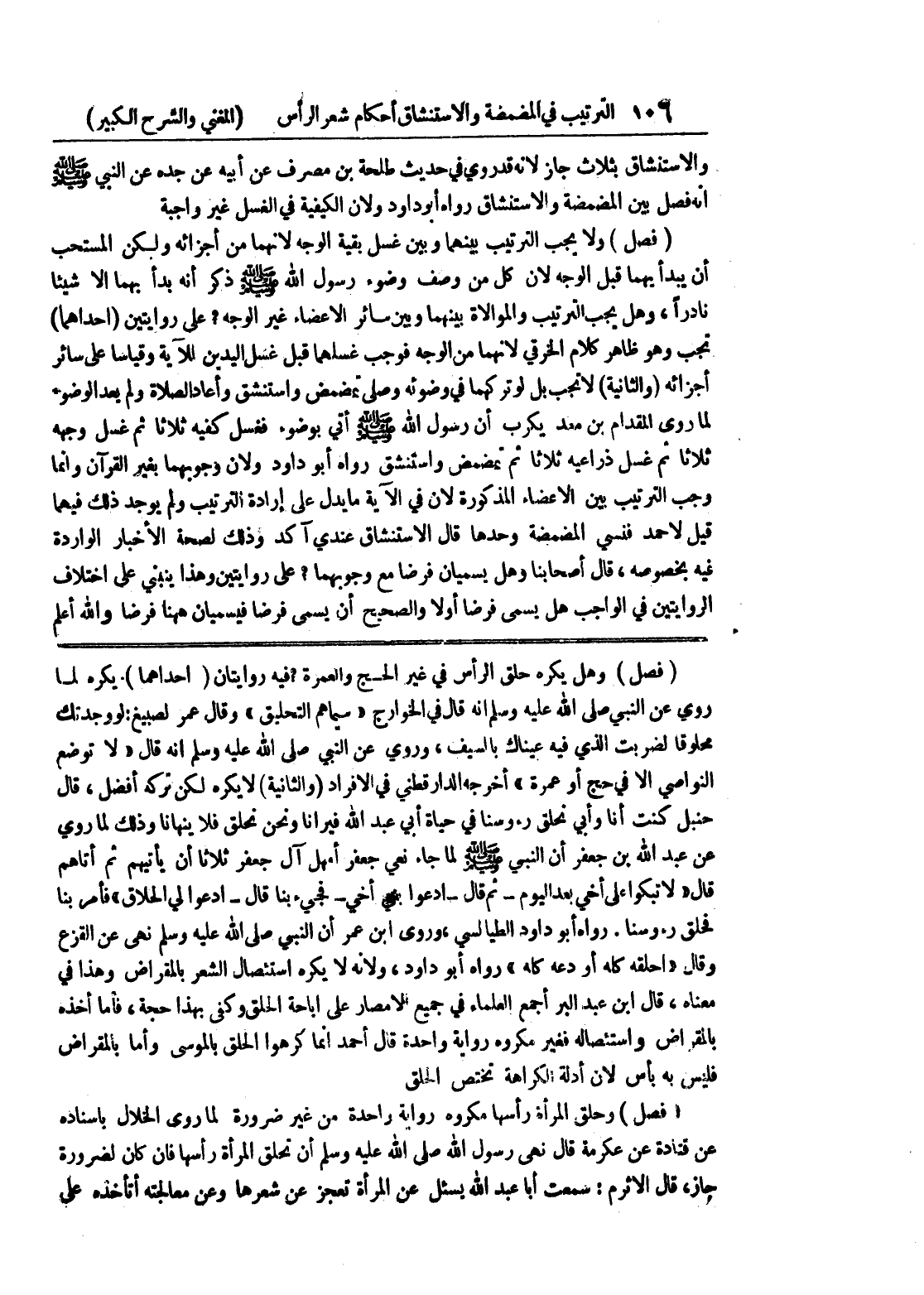 (فصل) وهل يكره حلق الرأس في غير الحج والعمرة؟ فيه روايتان (إحداهما) يكره لما روي عن النبي صلى الله عليه وسلم أنه قال في الخوارج " سيماهم التحليق " وقال عمر لصبيغ: لو وجدتك محلوقاً لضربت الذي فيه عيناك بالسيف، وروي عن النبي صلى الله عليه وسلم أنه قال " لا توضع النواصي إلا في حج أو عمرة " أخرجه الدارقطني في الأفراد (والثانية) لا يكره لكن تركه أفضل، قال حنبل كنت أنا وأبي نحلق رؤوسنا في حياة أبي عبد الله فيرانا ونحن نحلق فلا ينهانا وذلك لما روى عن عبد الله بن جعفر أن النبي صلى الله عليه وسلم لما جاء نعي جعفر أمهل آل جعفر ثلاثا أن يأتيهم ثم أتاهم