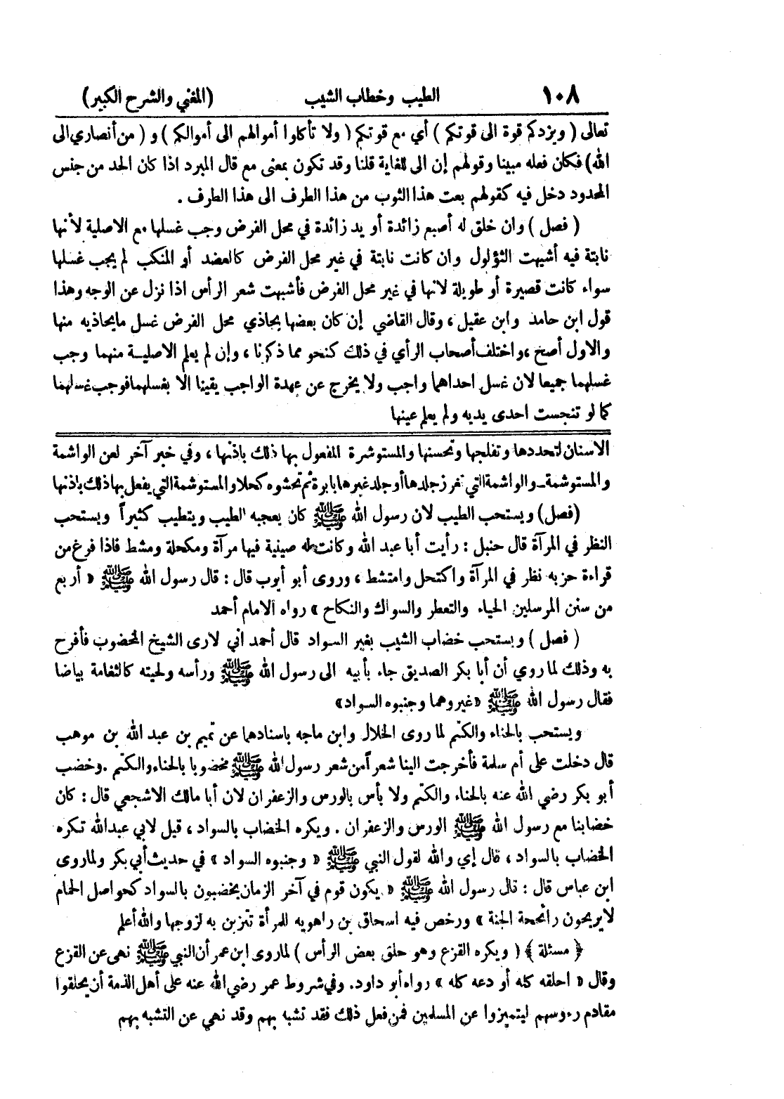 الأسنان لتحددها وتفلجها وتحسنها والمستوشرة المفعول بها ذلك بإذنها، وفي خبر آخر لعن الواشمة والمستوشمة - والواشمة التي تغرز جلدها أو جلد غيرها بإبرة ثم تحشوه كحلا والمستوشمة التي يفعل بها ذلك بإذنها (فصل) ويستحب الطيب لأن رسول الله صلى الله عليه وسلم كان يعجبه الطيب ويتطيب كثيرا ويستحب النظر في المرآة قال حنبل: رأيت أبا عبد الله وكانت له صينية فيها مرآة ومكحلة ومشط فإذا فرغ من قراءة حزبه نظر في المرآة واكتحل وامتشط، وروى أبو أيوب قال: قال رسول الله صلى الله عليه وسلم " أربع من سنن المرسلين الحياء والتعطر والسواك والنكاح " رواه الإمام أحمد (فصل) ويستحب خضاب الشيب بغير السواد قال أحمد إني لأرى الشيخ المخضوب فأفرح به وذلك لما روى أن أبا بكر الصديق جاء بأبيه إلى رسول الله صلى الله عليه وسلم ورأسه ولحيته كالثغامة بياضا فقال رسول الله صلى الله عليه وسلم " غيروهما وجنبوه السواد " ويستحب بالحناء والكتم لما روى الخلال وابن ماجة بإسنادهما عن تميم بن عبد الله بن موهب قال دخلت على أم سلمة فأخرجت إلينا شعرا من شعر رسول الله صلى الله عليه وسلم مخضوبا بالحناء والكتم.