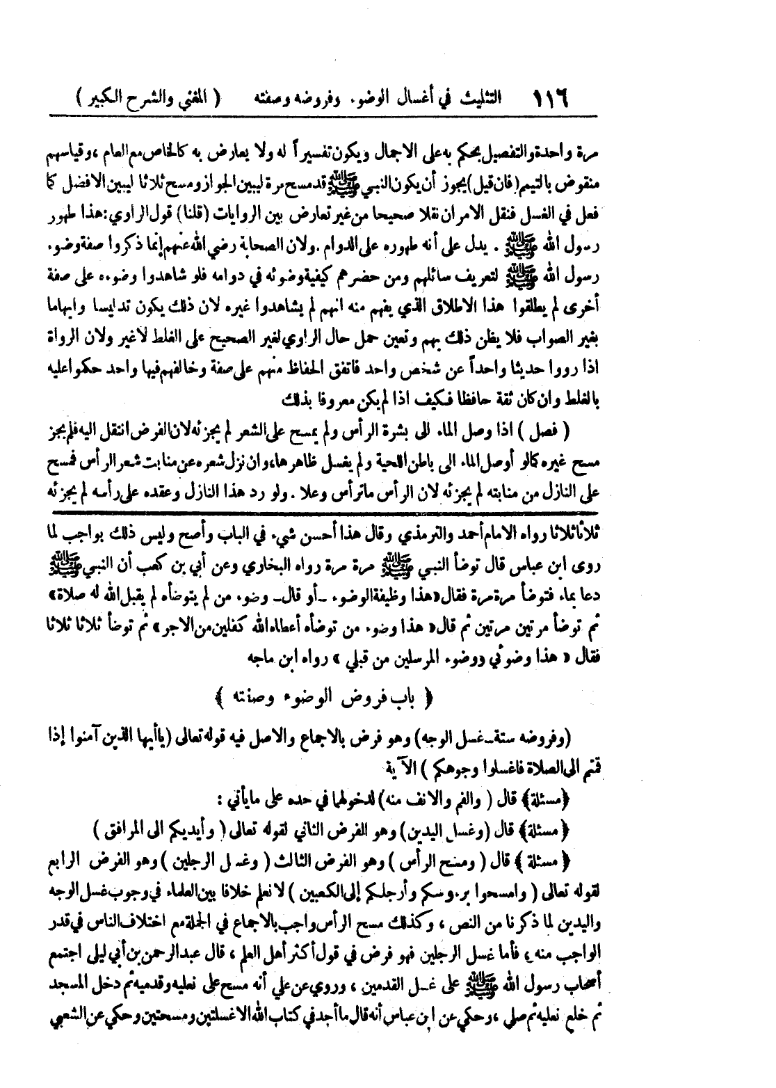 ثلاثا ثلاثا رواه الإمام أحمد والترمذي وقال هذا أحسن شئ في الباب وأصح وليس ذلك بواجب لما روى ابن عباس قال توضأ النبي صلى الله عليه وسلم مره مرة رواه البخاري وعن أبي بن كعب أن النبي صلى الله عليه وسلم دعا بماء فتوضأ مرة مرة فقال " هذا وظيفة الوضوء - أو قال - وضوء من لم يتوضأه لم يقبل الله له صلاة " ثم توضأ مرتين مرتين ثم قال " هذا وضوء من توضأه أعطاه الله كفلين من الأجر " ثم توضأ ثلاثا ثلاثا فقال " هذا وضوئي ووضوء المرسلين من قبلي " رواه ابن ماجه (باب فروض الوضوء وصفته) (وفروضه ستة - غسل الوجه) وهو فرض بالإجماع والأصل فيه قوله تعالى (يا أيها الذين آمنوا إذا قمتم إلى الصلاة فاغسلوا وجوهكم) الآية (مسألة) قال (والفم والأنف منه) لدخولهما في حده على ما يأتي: