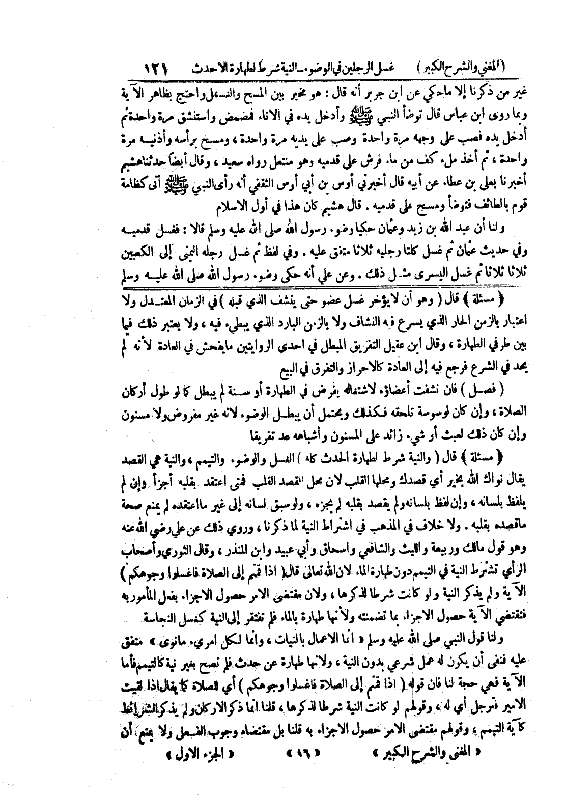 ولا خلاف في المذهب في اشتراط النية لما ذكرنا، وروي ذلك عن علي رضي الله عنه وهو قول مالك وربيعة والليث والشافعي واسحاق وأبي عبيد وابن المنذر، وقال الثوري وأصحاب الرأي تشترط النية في التيمم دون طهارة الماء لأن الله تعالى قال (إذا قمتم إلى الصلاة فاغسلوا وجوهكم) الآية ولم يذكر النية ولو كانت شرطاً لذكرها، ولأن مقتضى الأمر حصول الإجزاء بفعل المأمور به فتقتضي الآية حصول الإجزاء بما تضمنته ولأنها طهارة بالماء فلم تفتقر إلى النية كغسل النجاسة ولنا قول النبي صلى الله عليه وسلم " إنما الأعمال بالنيات، وإنما لكل امرئ ما نوى " متفق عليه فنفى أن يكون له عمل شرعي بدون النية، ولأنها طهارة عن حدث فلم تصح بغير نية كالتيمم فأما الآية فهي حجة لنا فإن قوله (إذا قمتم إلى الصلاة فاغسلوا وجوهكم) أي للصلاة كما يقال إذا لقيت الأمير فترجل أي له، وقولهم لو كانت النية شرطا لذكرها، قلنا إنما ذكر الأركان ولم يذكر الشرائط كآية التيمم، وقولهم مقتضى الأمر حصول الإجزاء به قلنا بل مقتضاه وجوب الفعل ولا يمنع أن