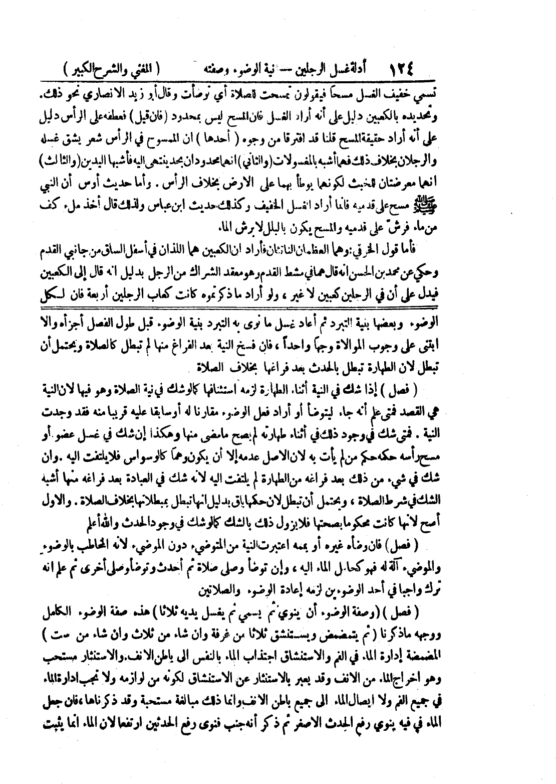 الوضوء وبعضها بنية التبرد ثم أعاد غسل ما نوى به التبرد بنية الوضوء قبل طول الفصل أجزأه وإلا ابتنى على وجوب الموالاة وجهاً واحدا، فإن فسخ النية بعد الفراغ منها لم تبطل كالصلاة ويحتمل أن تبطل لأن الطهارة تبطل بالحدث بعد فراغها بخلاف الصلاة (فصل) إذا شك في النية أثناء الطهارة لزمه استئنافها كما لو شك في نية الصلاة وهو فيها لأن النية هي القصد فمتى علم أنه جاء ليتوضأ أو أراد فعل الوضوء مقارنا له أو سابقا عليه قريبا منه فقد وجدت النية.