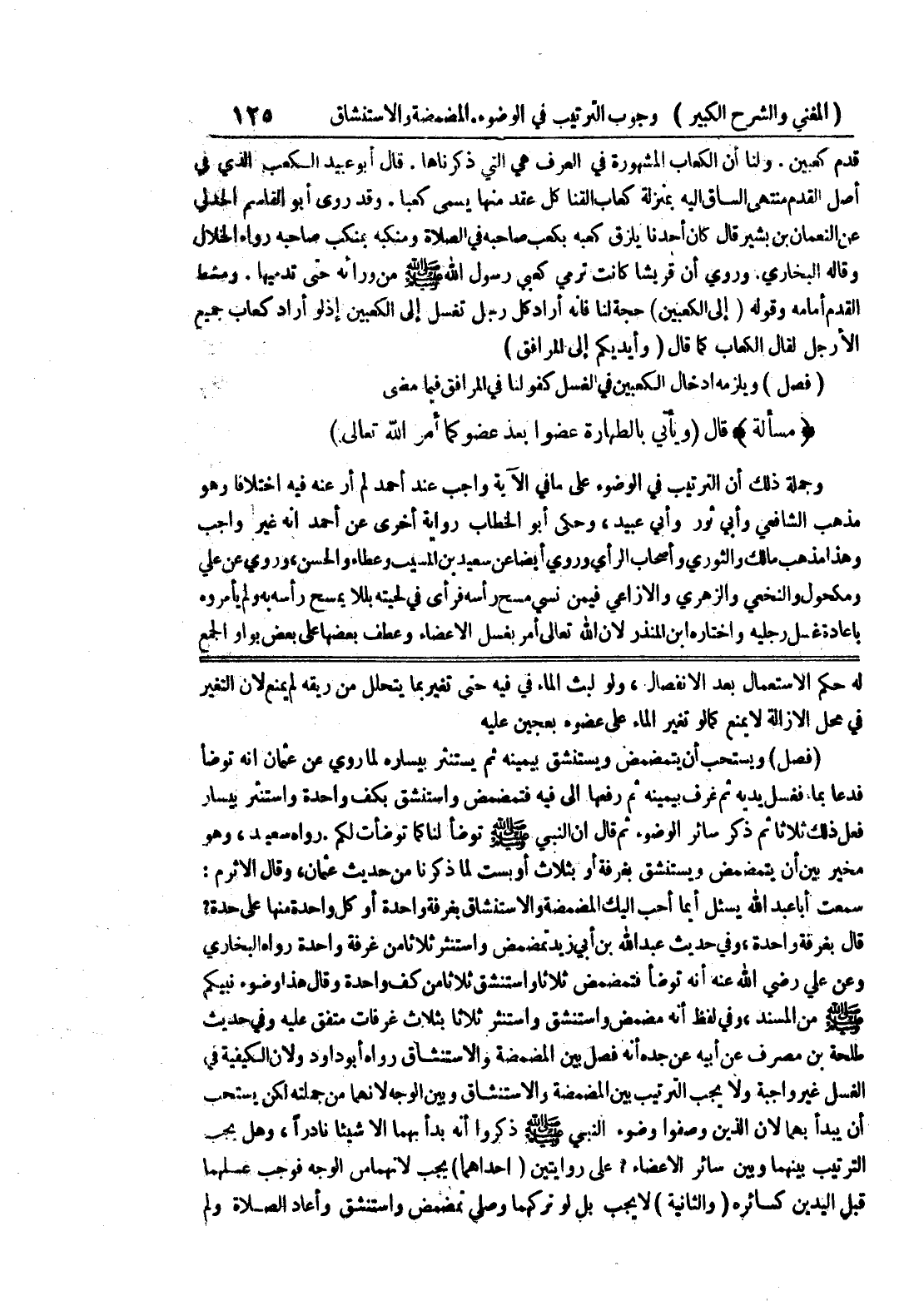 له حكم الاستعمال بعد الانفصال، ولو لبث الماء في فيه حتى تغير بما يتحلل من ريقه لم يمنع لأن التغير في محل الإزالة لا يمنع كما لو تغير الماء على عضوه بعجين عليه (فصل) ويستحب أن يتمضمض ويستنشق بيمينه ثم يستنثر بيساره لما روي عن عثمان انه توضأ فدعا بماء فغسل يديه ثم غرف بيمينه ثم رفعها إلى فيه فتمضمض واستنشق بكف واحدة واستنثر بيسار فعل ذلك ثلاثا ثم ذكر سائر الوضوء ثم قال إن النبي صلى الله عليه وسلم توضأ لنا كما توضأت لكم.