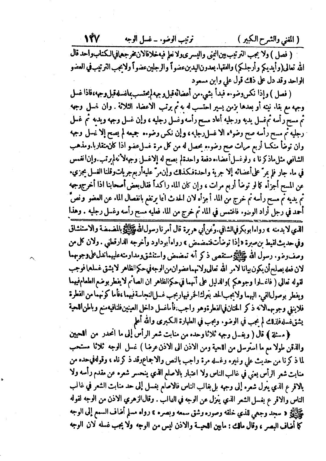 فأما غسل داخل العينين فلنا فيه منع وباطن اللحية يشق غسله فلذلك لم يجب في الوضوء ويجب في الطهارة الكبرى والله أعلم (مسألة) قال (ويغسل وجهه ثلاثا وحده من منابت شعر الرأس الى ما انحدر من اللحيين والذقن طولا مع ما استرسل من اللحية ومن الأذن إلى الأذن عرضا) غسل الوجه ثلاثا مستحب لما ذكرنا من حديث علي وغيره وغسله مرة واجب بالنص والإجماع وقد ذكرناه، وقوله في حده من منابت شعر الرأس يعني في غالب الناس ولا اعتبار بالأصلع الذي ينحسر شعره عن مقدم رأسه ولا بالأقرع الذي ينزل شعره إلى وجهه بل بغالب الناس فالأصلع يغسل إلى حد منابت الشعر في غالب الناس والأقرع يغسل الشعر الذي ينزل عن الوجه في الغالب.