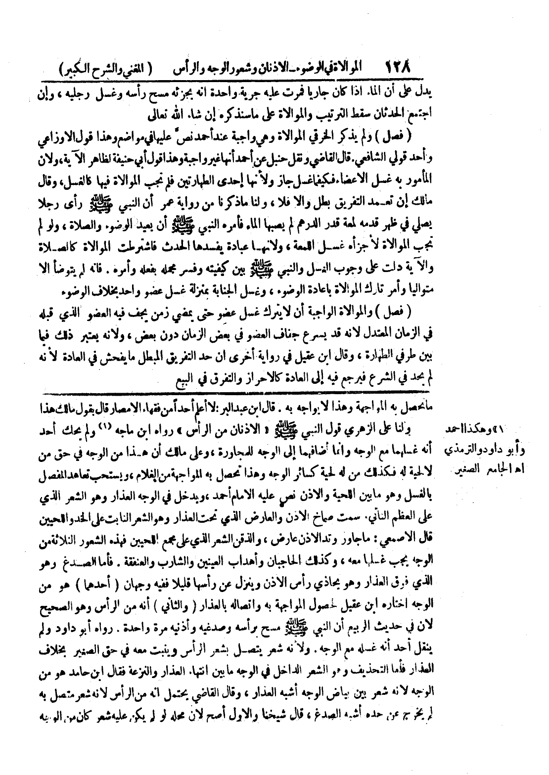 قال ابن عبد البر: لا أعلم أحداً من فقهاء الأمصار قال بقول مالك هذا ولنا على الزهري قول النبي صلى الله عليه وسلم " الأذنان من الرأس " رواه ابن ماجه (1) ولم يحك أحد أنه غسلهما مع الوجه وإنما أضافهما إلى الوجه للمجاورة، وعلى مالك أن هذا من الوجه في حق من لا لحية له فكذلك من له لحية كسائر الوجه وهذا تحصل به المواجهة من الغلام، ويستحب تعاهد المفصل بالغسل وهو ما بين اللحية والاذن نص عيه الإمام أحمد، ويدخل في الوجه العذار وهو الشعر الذي على العظم الناتي.
