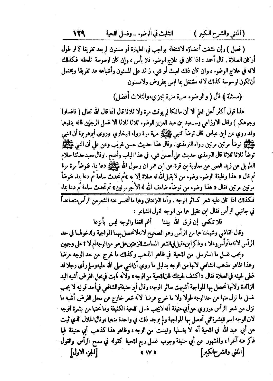 وأما النزعتان وهما ما انحسر عنه الشعر من الرأس متصاعدا في جانبي الرأس فقال ابن عقيل هما من الوجه لقول الشاعر: فلا تنكحي إن فرق الله بيننا * أغم القفا والوجه ليس بأنزعا وقال القاضي وشيخنا هما من الرأس وهو الصحيح لأنه لا تحصل بهما المواجهة ولدخولهما في حد الرأس لأنه ما ترأس وعلا، وذكر ابن عقيل في الشعر المسامت للنزعتين هل هو من الوجه أم لا؟ على وجهين ويجب غسل ما استرسل من اللحية في ظاهر المذهب وكذلك ما خرج عن حد الوجه عرضا وهذا ظاهر مذهب الشافعي لأنها من الوجه بدليل ما روي أن النبي صلى الله عليه وسلم رأى رجلاً قد غطى لحيته في الصلاة فقال " اكشف لحيتك فإن اللحية من الوجه " ولانه نابت في محل الفرض أشبه اليد الزائدة ولأنها تحصل بها المواجهة أشبهت سائر الوجه، وقال أبو حنيفة والشافعي في أحد قوليه لا يجب غسل ما نزل منها عن حد الوجه طولا ولا ما خرج عرضا لأنه شعر خارج عن محل الفرض أشبه ما نزل من شعر الرأس، وروي عن أبي حنيفة أنه لا يجب غسل اللحية الكثيفة وما تحتها من بشرة الوجه لأن الوجه اسم للبشرة التي تحصل بها المواجهة ولم يوجد ذلك في واحدة منهما، وقال الخلال الذي ثبت