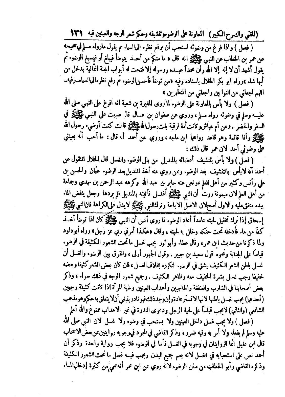 وجميع شعور الوجه في ذلك سواء، وذكر بعض أصحابنا في الشارب والعنفقة والحاجبين وأهداب العينين ولحية المرأة إذا كانت كثيفة وجهين (أحدهما) يجب غسل باطنها لأنها لا تستر عادة وإن وجد ذلك فهو نادر ينبغي ان لا يتعلق به حكم وهو مذهب الشافعي (والثاني) لا يجب قياسا على لحية الرجل ودعوى الندرة في غير الأهداب ممنوع والله أعلم (فصل) ولا يجب غسل داخل العينين ولا يستحب في وضوء ولا غسل لأن النبي صلى الله عليه وسلم لم يفعله ولا أمر به وفيه ضرر، وذكر القاضي في المجرد في وجوبه روايتين عن بعض الأصحاب قال ابن عقيل إنما الروايتان في وجوبه في الغسل فأما في الوضوء فلا يجب رواية واحدة وذكر أن أحمد نص على استحبابه في الغسل لأنه يعم جميع البدن ويجب فيه غسل ما تحت الشعور الكثيفة وذكره القاضي وابو الخطاب من سنن الوضوء لأنه روي عن ابن عمر أنه عمي من كثرة إدخال الماء