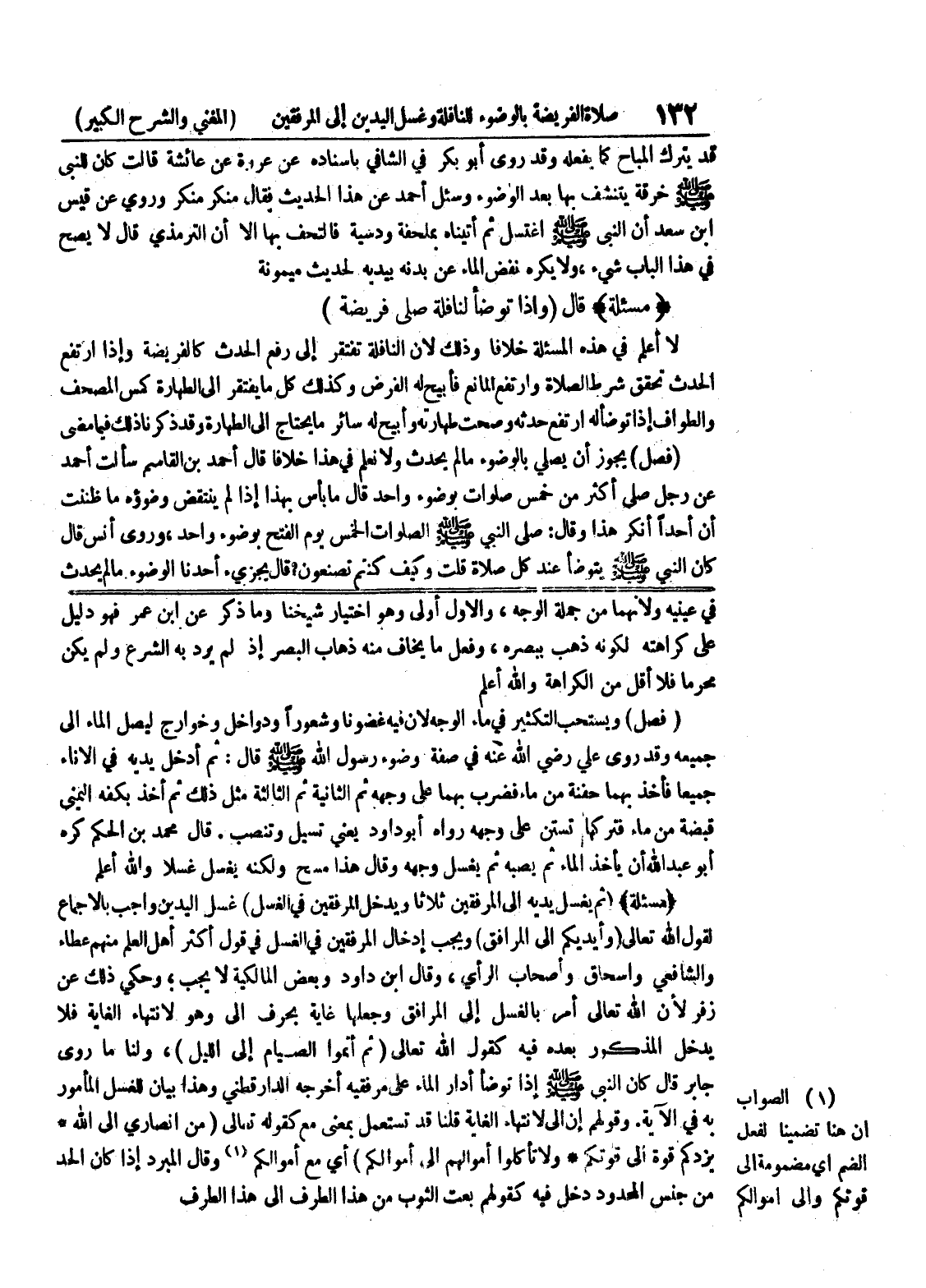 قال محمد بن الحكم كره أبو عبد الله أن يأخذ الماء ثم يصبه ثم يغسل وجهه وقال هذا مسح ولكنه يغسل غسلا والله أعلم (مسألة) (ثم يغسل يديه إلى المرفقين ثلاثا ويدخل المرفقين في الغسل) غسل اليدين واجب بالإجماع لقول الله تعالى (وأيديكم إلى المرافق) ويجب إدخال المرفقين في الغسل في قول أكثر أهل العلم منهم عطاء والشافعي واسحاق وأصحاب الرأي، وقال ابن داود وبعض المالكية لا يجب، وحكي ذلك عن