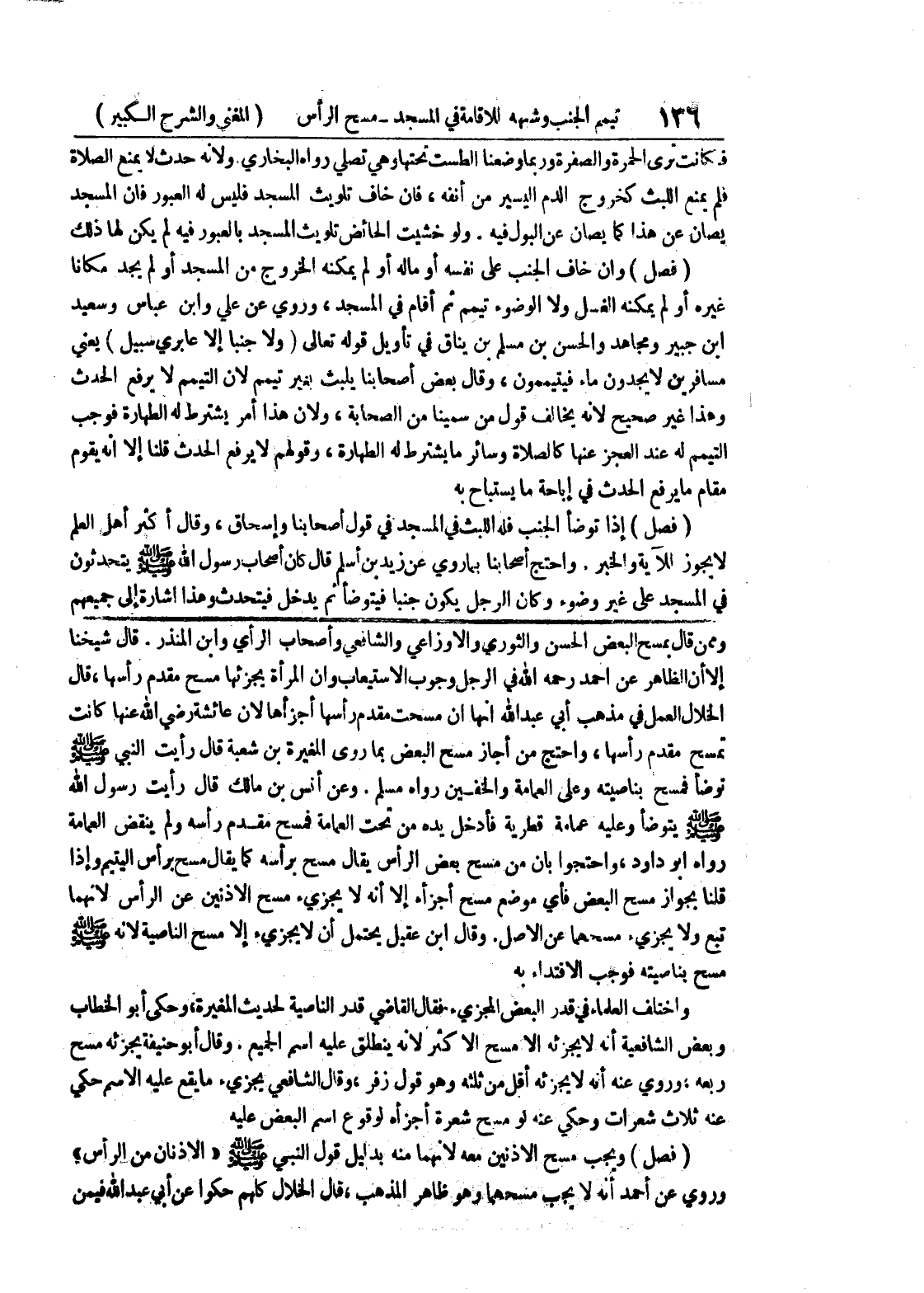 وقال أبو حنيفة يجزئه مسح ربعه، وروي عنه أنه لا يجزئه أقل من ثلثه وهو قول زفر، وقال الشافعي يجزئ ما يقع عليه الاسم حكى عنه ثلاث شعرات وحكى عنه لو مسح شعرة أجزأه لوقوع اسم البعض عليه (فصل) ويجب مسح الأذنين معه لأنهما منه بدليل قول النبي صلى الله عليه وسلم " الأذنان من الرأس " وروى عن أحمد انه لا يجب مسحهما وهو ظاهر المذهب، قال الخلال كلهم حكوا عن أبي عبد الله فيمن