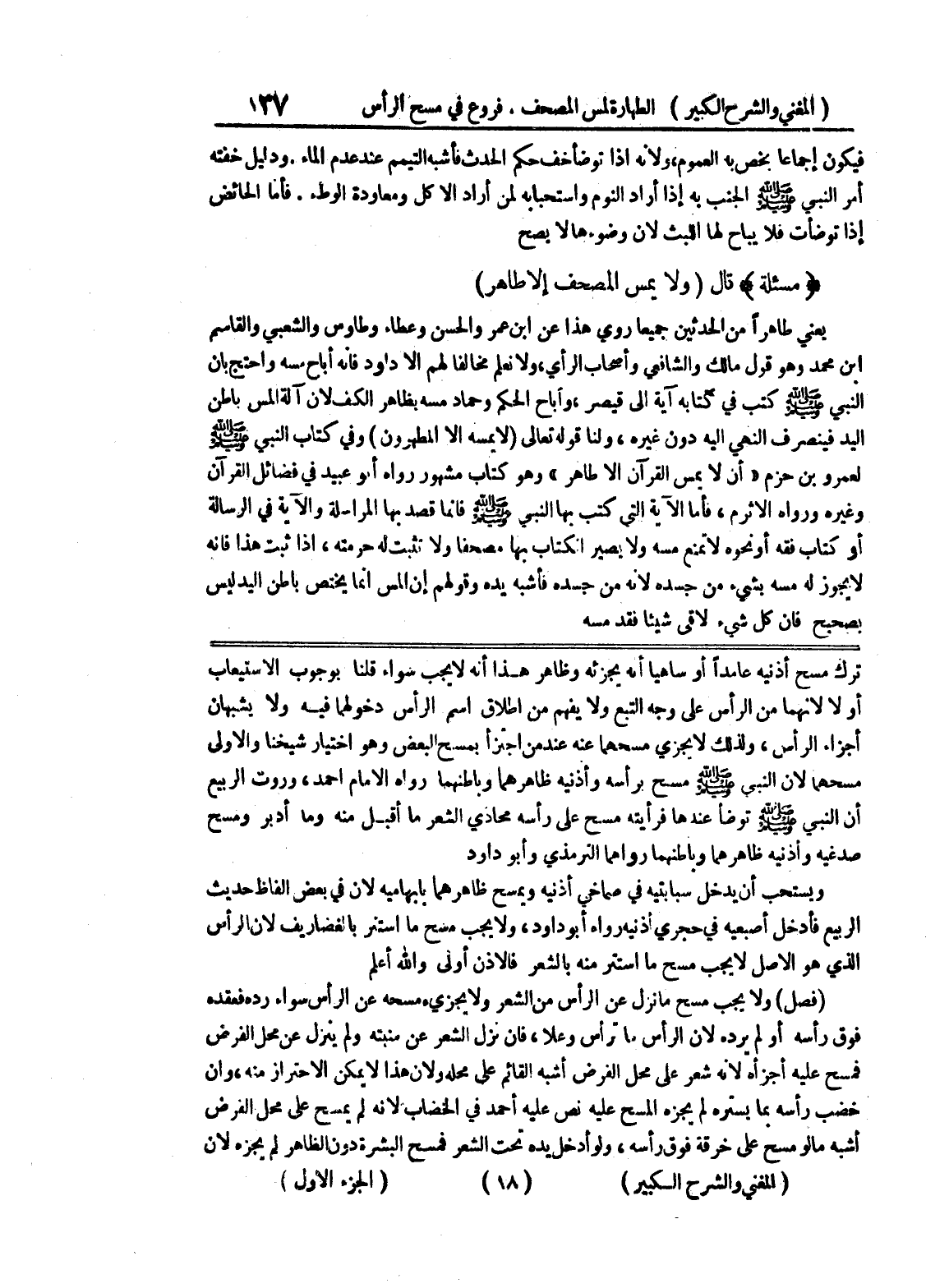 ترك مسح أذنيه عامداً أو ساهياً أنه يجزئه وظاهر هذا أنه لا يجب سواء قلنا بوجوب الاستيعاب أو لا لأنهما من الرأس على وجه التبع ولا يفهم من إطلاق اسم الرأس دخولهما فيه ولا يشبهان أجزاء الرأس، ولذلك لا يجزي مسحهما عنه عند من اجتزأ بمسح البعض وهو اختيار شيخنا والأولى مسحهما لأن النبي صلى الله عليه وسلم مسح برأسه وأذنيه ظاهرهما وباطنهما رواه الإمام أحمد، وروت الربيع أن النبي صلى الله عليه وسلم توضأ عندها فرأيته مسح على رأسه محاذي الشعر ما أقبل منه وما أدبر ومسح صدغيه وأذنيه ظاهرهما وباطنهما رواهما الترمذي وأبو داود ويستحب أن يدخل سبابتيه في صماخي أذنيه ويمسح ظاهرهما بابهاميه لأن في بعض ألفاظ حديث الربيع فأدخل أصبعيه في حجري أذنيه رواه أبو داود، ولا يجب مسح ما استتر بالغضاريف لأن الرأس الذي هو الأصل لا يجب مسح ما استتر منه بالشعر فالأذن أولى والله أعلم (فصل) ولا يجب مسح ما نزل عن الرأس من الشعر ولا يجزئ مسحه عن الرأس سواء رده فعقده فوق رأسه أو لم يرده لأن الرأس ما ترأس وعلا، فإن نزل الشعر عن منبته ولم ينزل عن محل الفرض فمسح عليه أجزأه لأنه شعر على محل الفرض أشبه القائم على محله ولأن هذا لا يمكن الاحتراز منه، وإن خضب رأسه بما يستره لم يجزه المسح عليه نص عليه أحمد في الخضاب لأنه لم يمسح على محل الفرض أشبه مالو مسح على خرقة فوق رأسه، ولو أدخل يده تحت الشعر فمسح البشرة دون الظاهر لم يجزه لأن